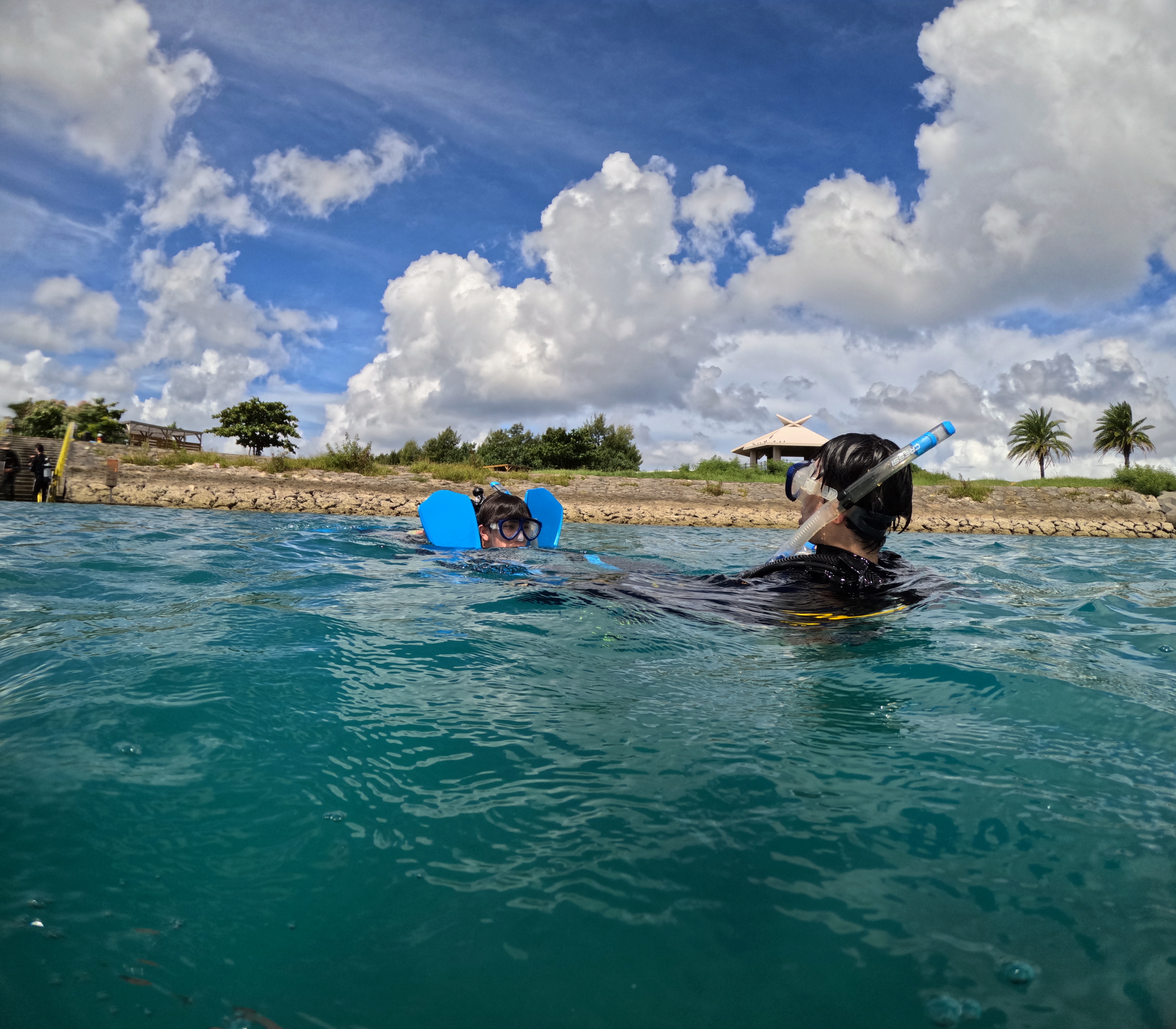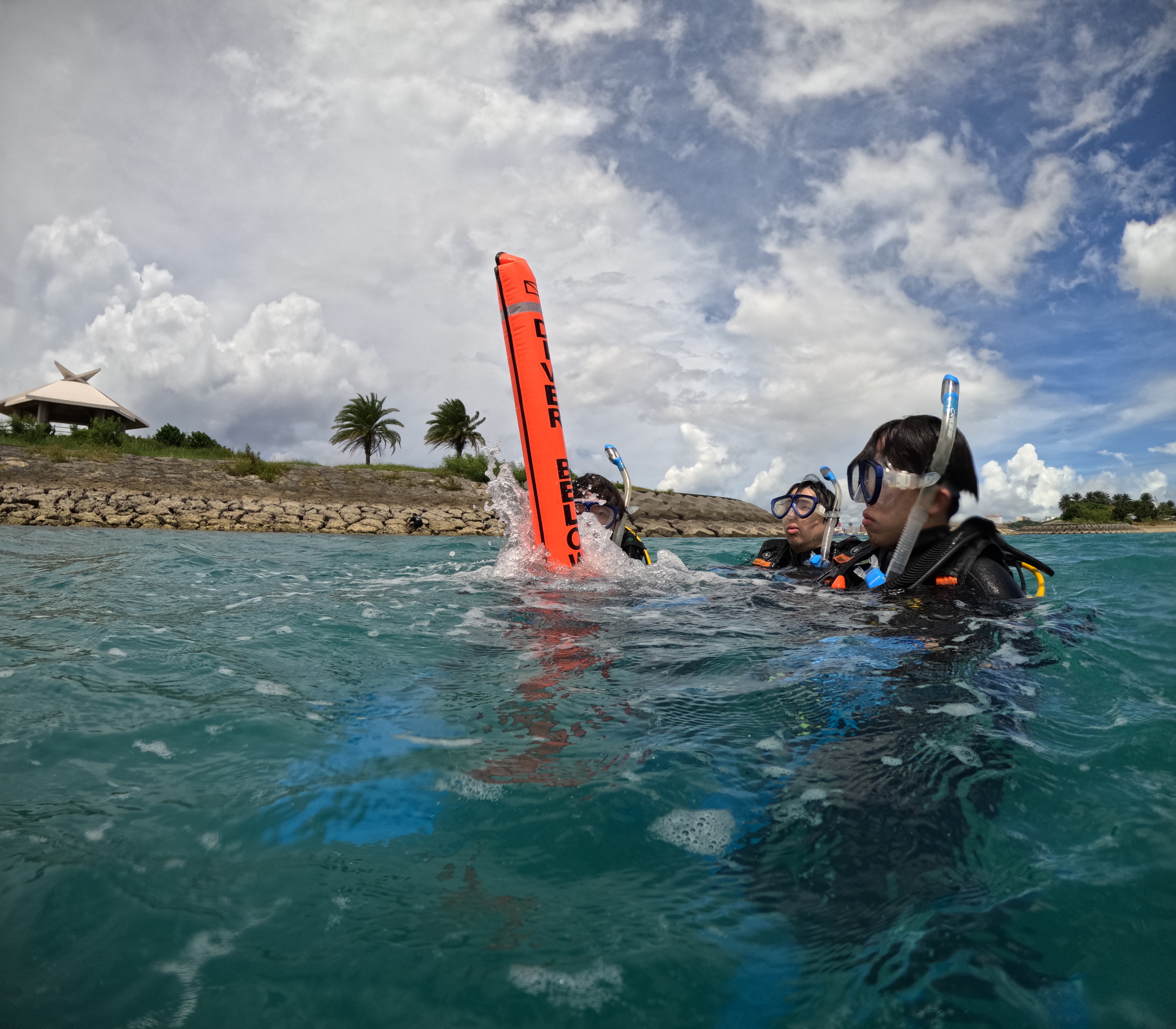 水面でオーラルによるBCDへの給気は、エア切れ時の重要な対応スキルですので、初めは足の着く海域でしっかりとイメージしながら練習します。