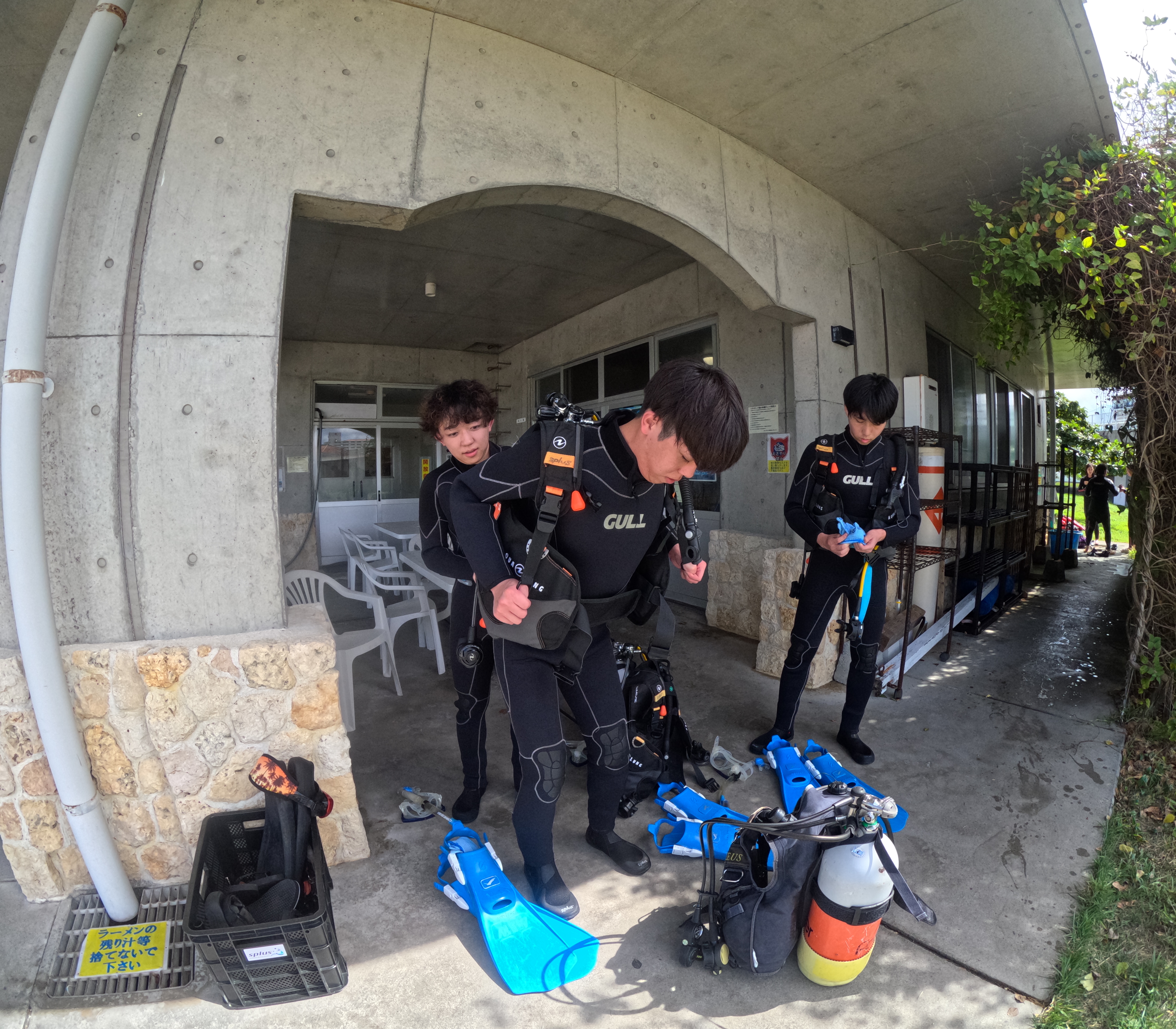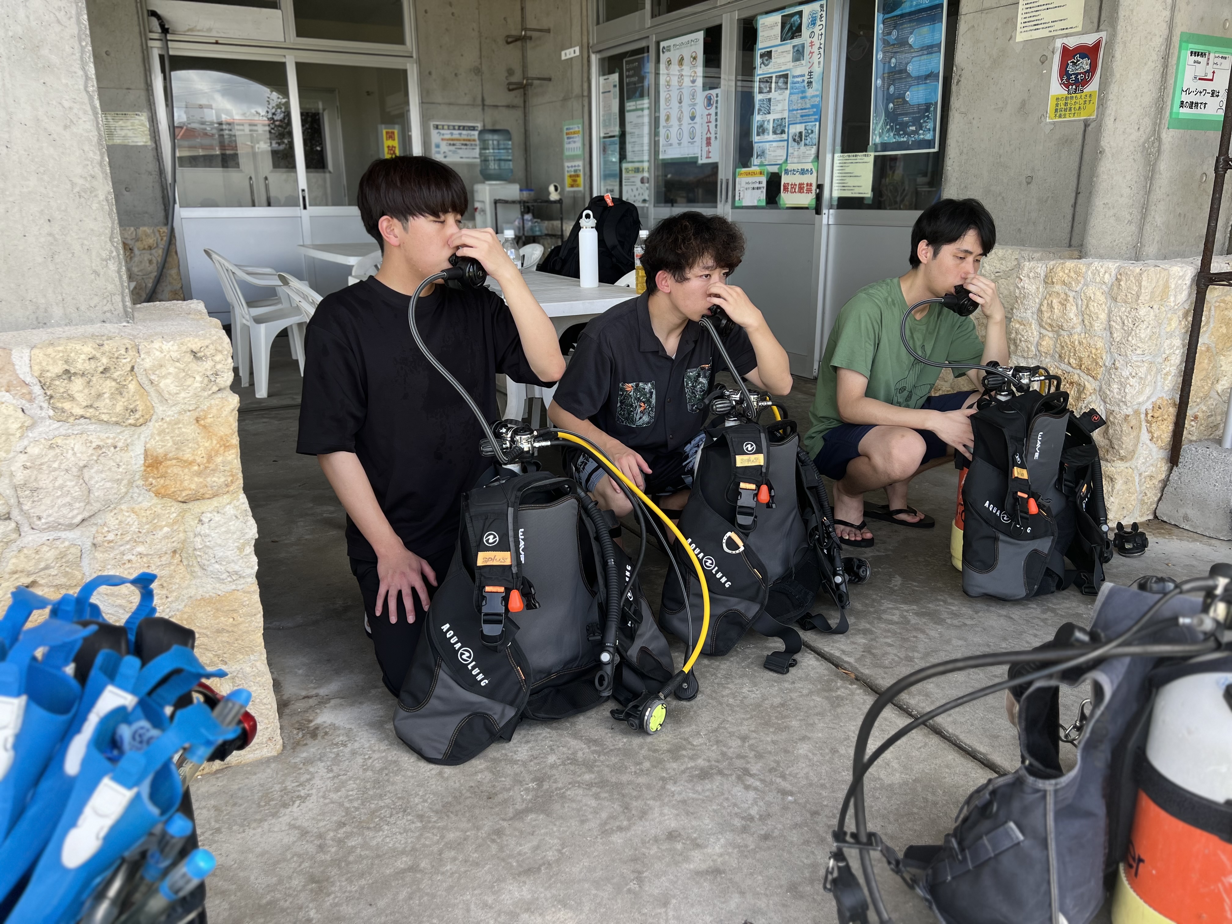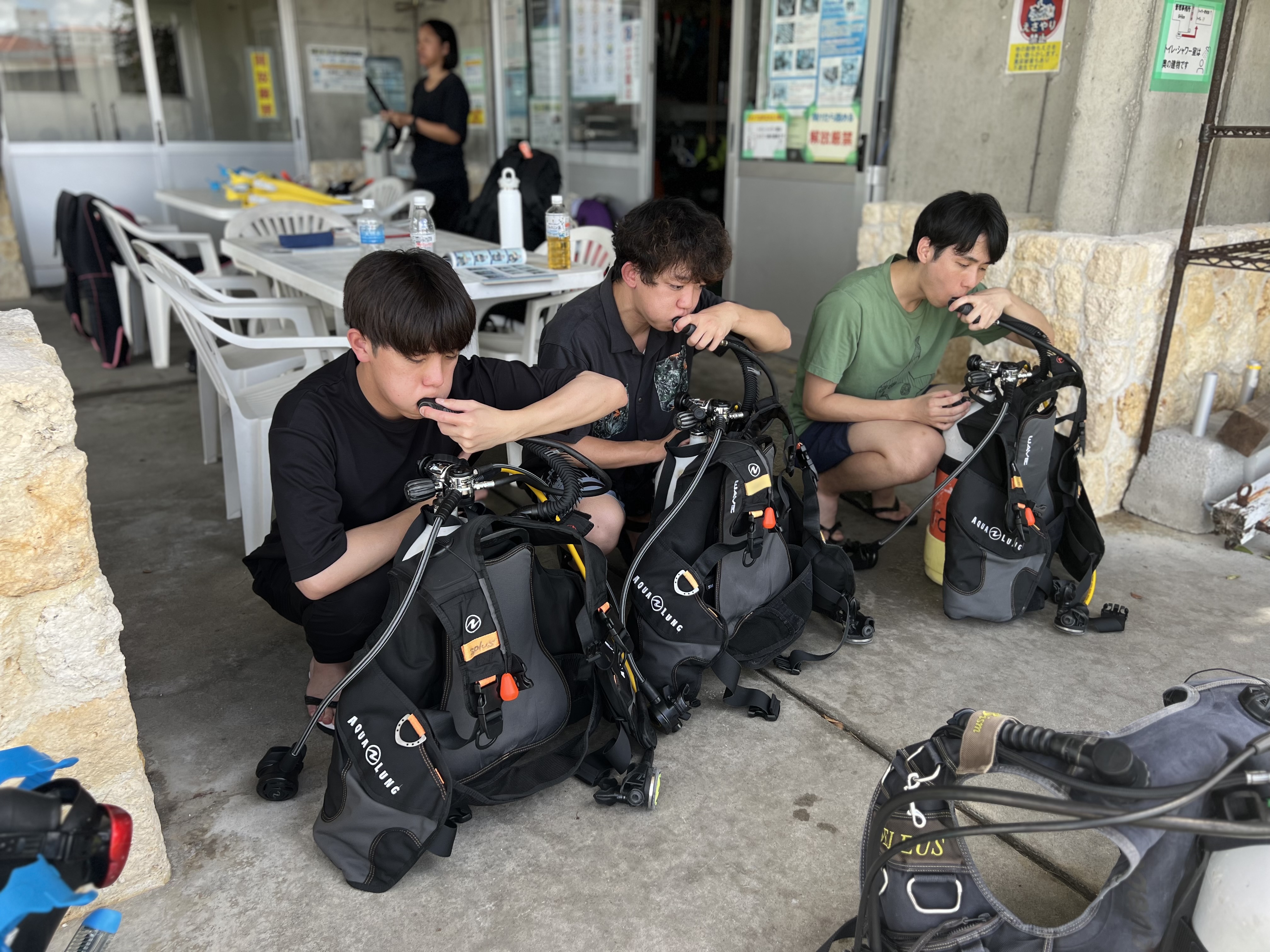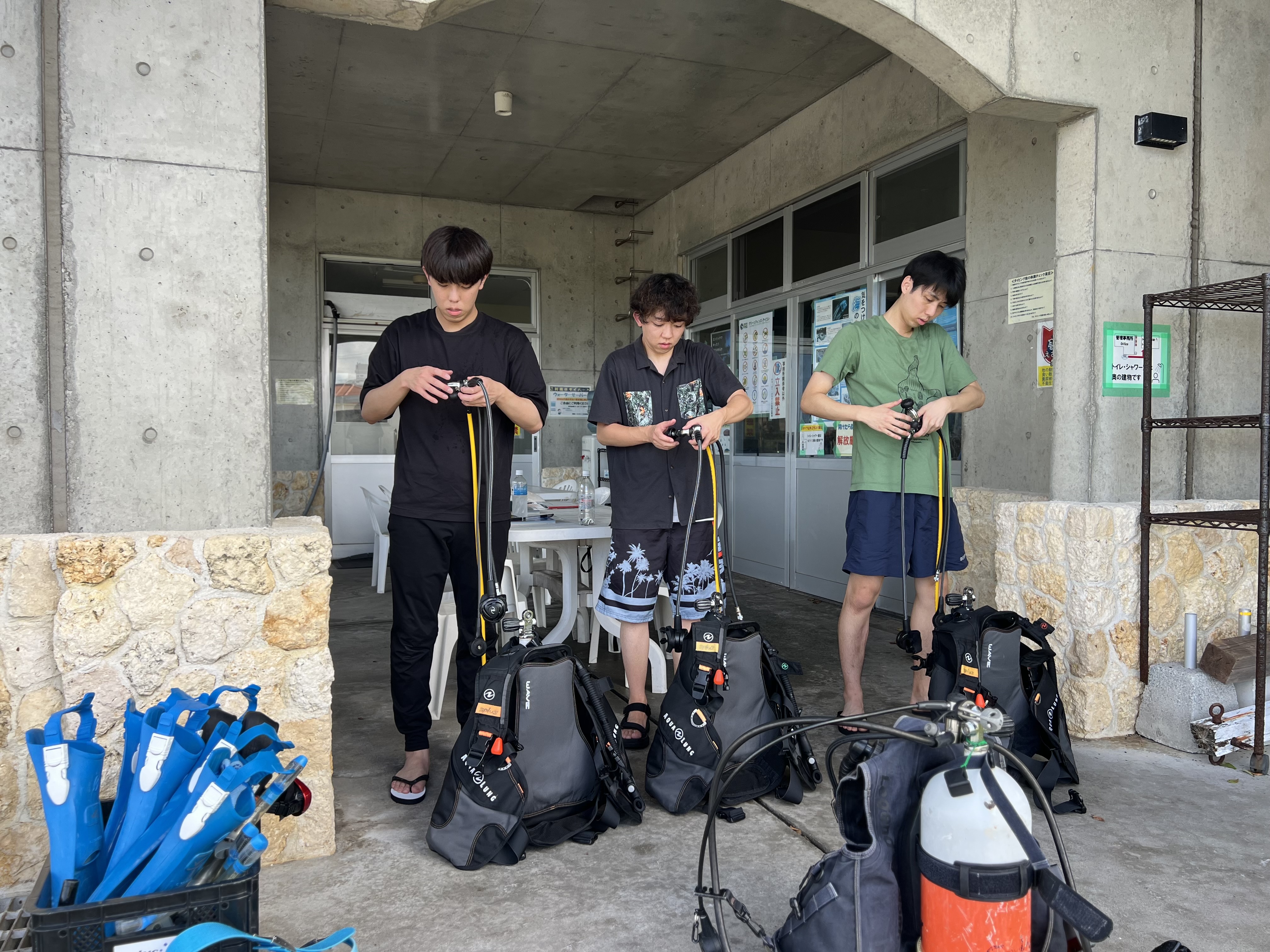 器材セッティングは、単に組み立てればよいだけではありません。楽しく安全にダイビングするための基本となるものですので、器材を身体に快適にフィットさせ、適切に作動させるために正しくセッティングする必要があります。覚えることが多く初めて行う方にとってはなかなか難しいですが、器材の名称やその役割をしっかりと理解し動作を繰り返し行うことで徐々に覚えていき、回数を重ねるごとにめきめきと上達していきました。