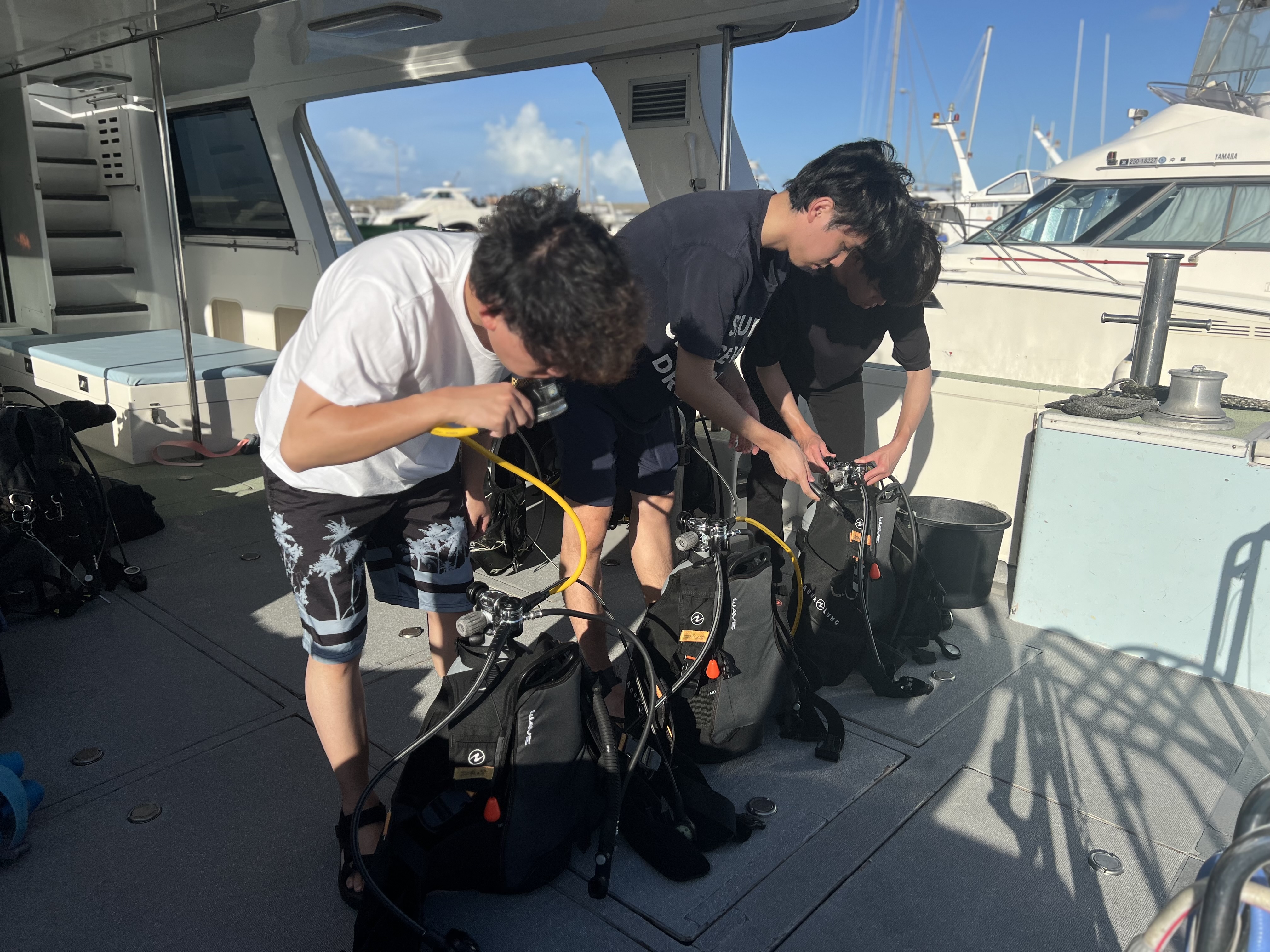 出航前の朝の準備、まずはボート上での器材のセッティングと作動点検から始まります。常に安全にダイビングをするためには基本事項の徹底が大切となります。初日のビーチでの講習でたくさん練習したので、スムーズに行うことが出来ました。