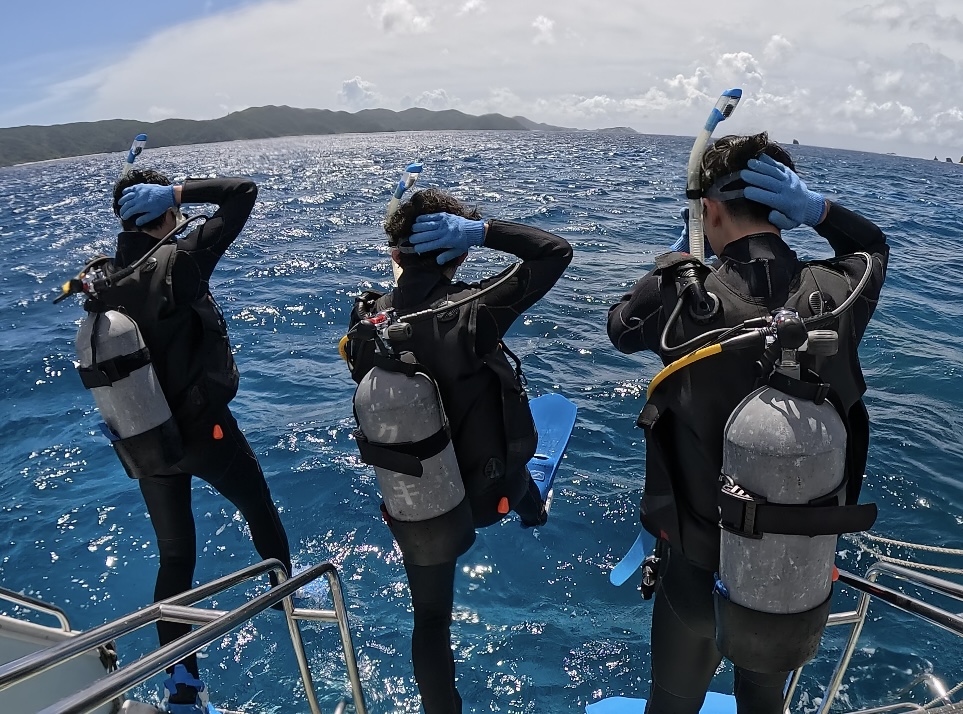 那覇から西へおよそ1時間程ボートを走らせると、慶良間諸島周辺海域のダイビングポイントへ到着します。台風の影響でやや透明度は落ちているものの、それでも綺麗な海でオープン・ウォーター・ダイブの講習が始まります。