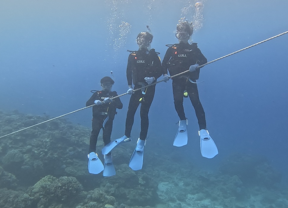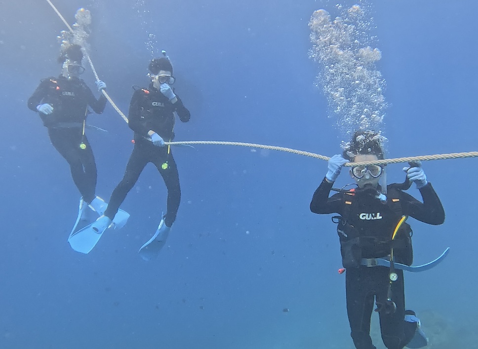 最初のオープン・ウォーター・ダイブは、ロープを使ったコントロールされた潜降から始まります。自分達のペースでゆっくりと慎重に耳抜きをしながら呼吸をコントロールして潜降していきます。
