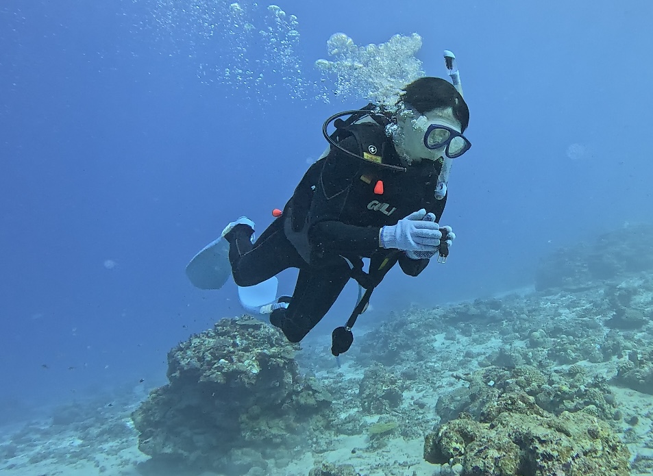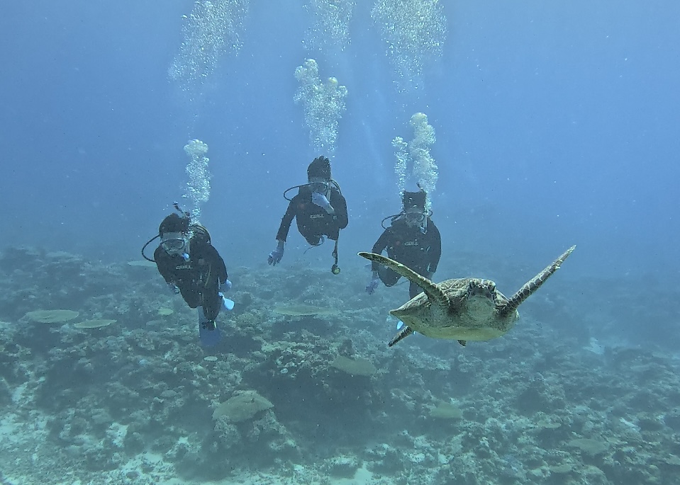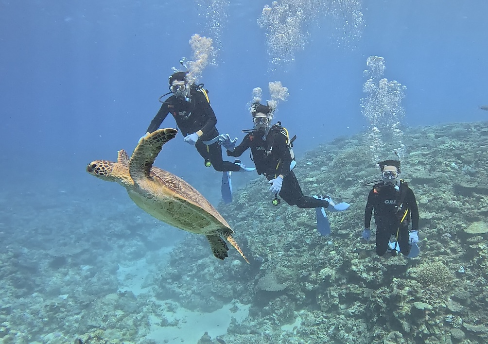講習後のファンダイビングでは、幸運にもウミガメと出会えたので一緒に泳いだり写真を撮ったり、綺麗な珊瑚礁やたくさんの魚の群れを見て楽しんで来ました。