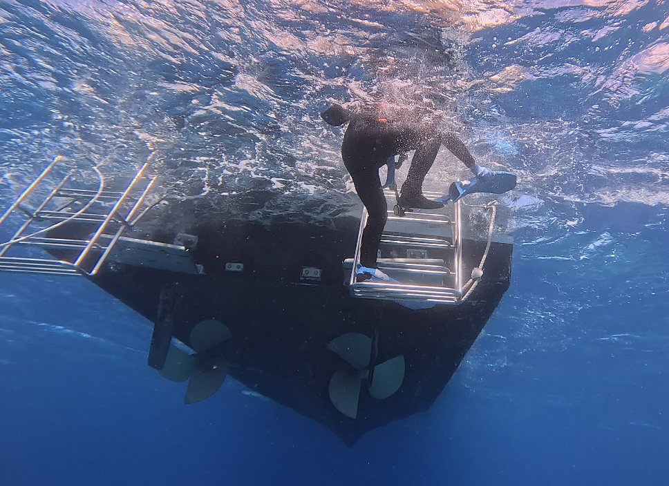 エキジットはラダーにしっかりとつかまりながら、フィンを外してボートへ戻ります。