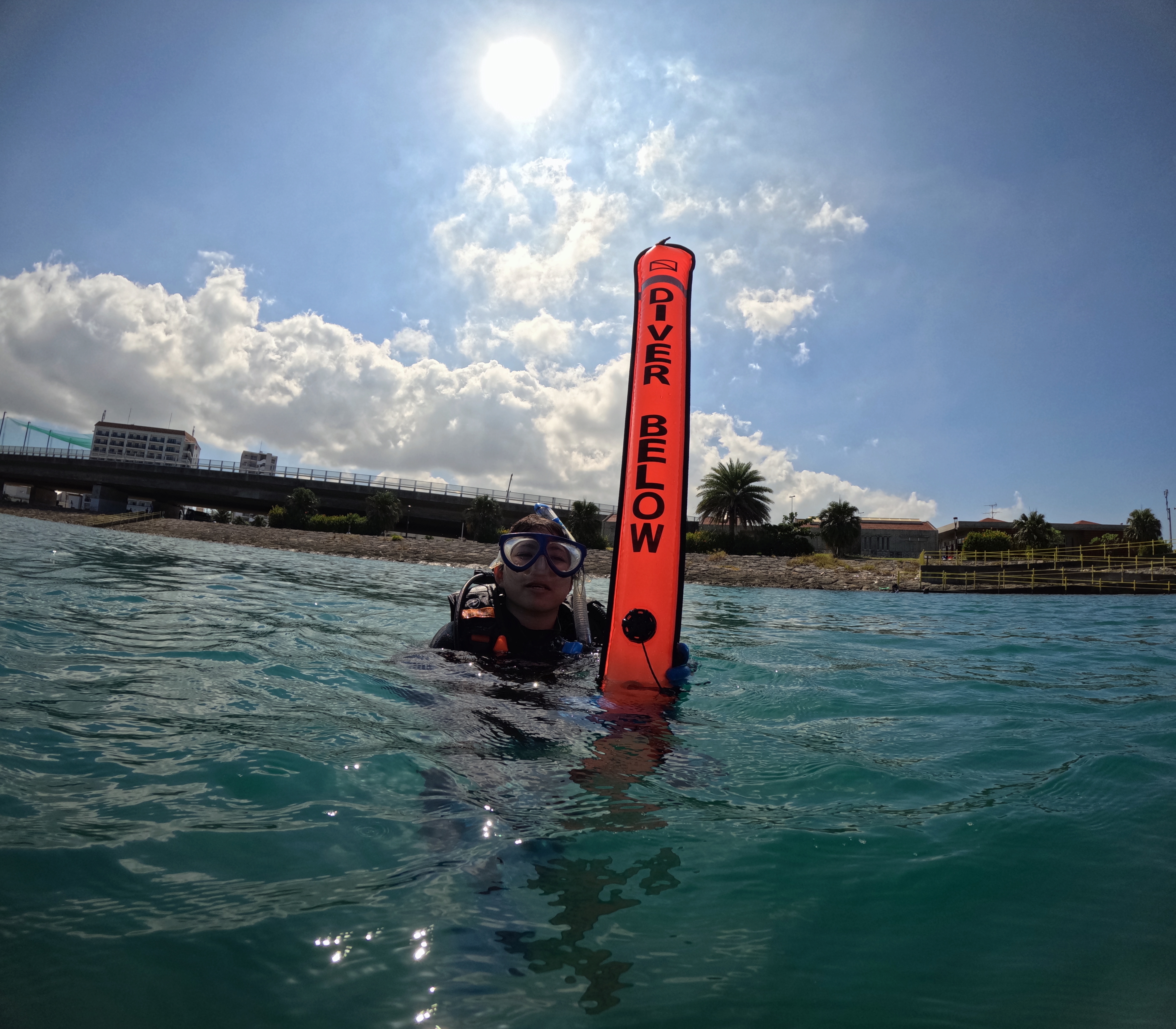 水面でオーラルによるBCDへの給気は、エア切れ時の重要な対応スキルですので、初めは足の着く海域でしっかりとイメージしながら練習します。