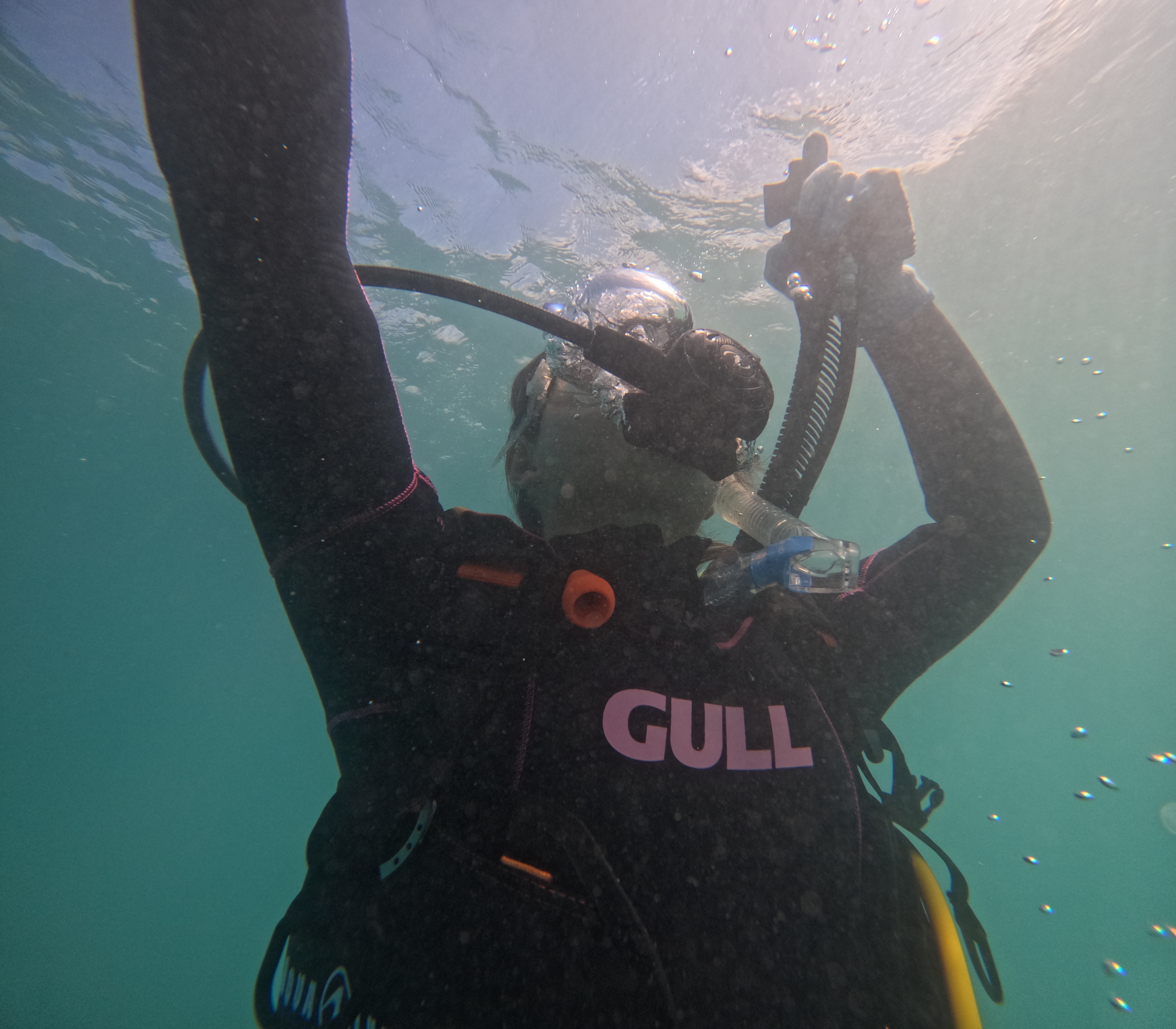 水中でのスクーバ・キッド脱着は、身体のバランスが崩れやすいスキルですが、慌てることなく落ち着いて行うことが出来ました。