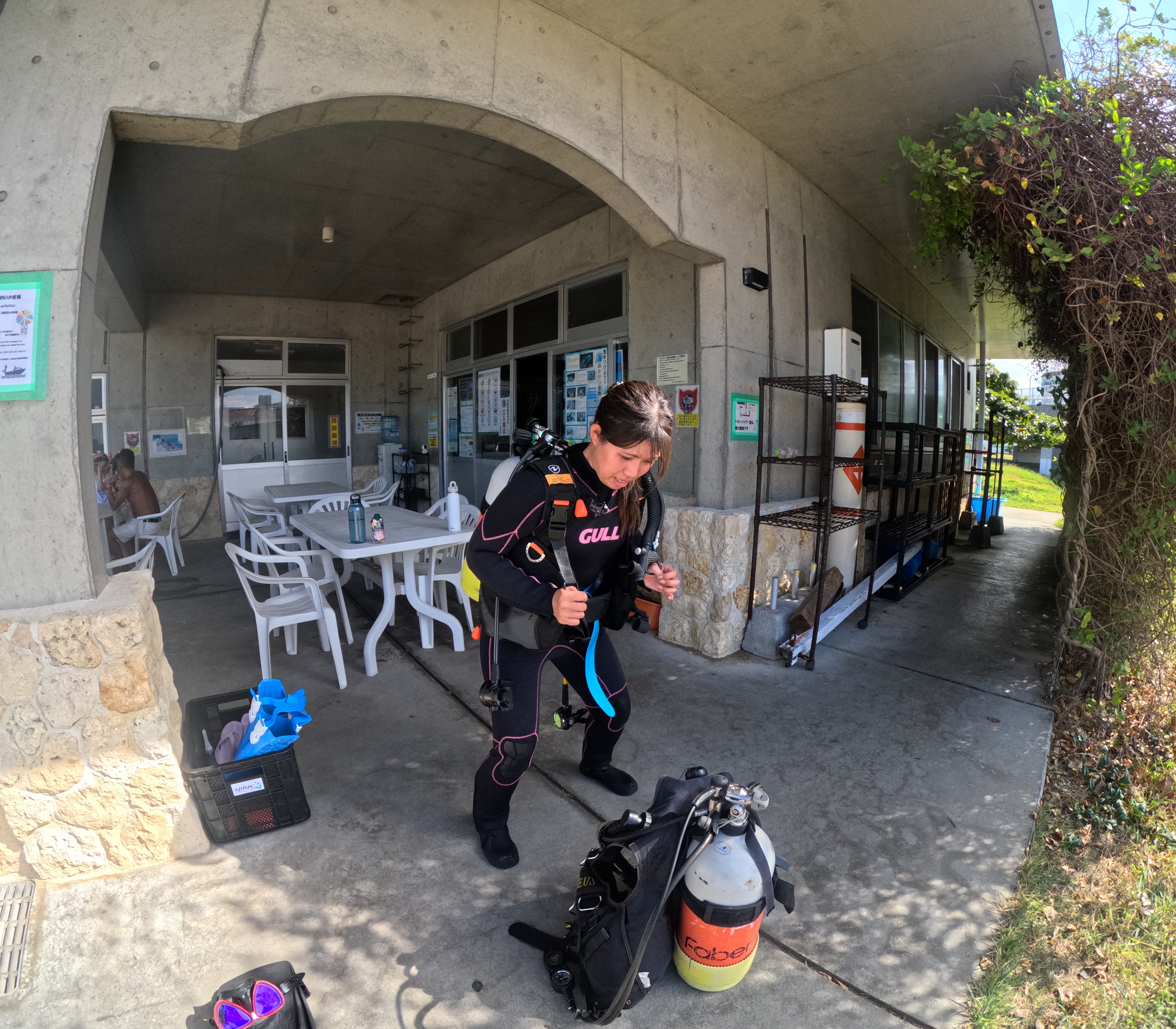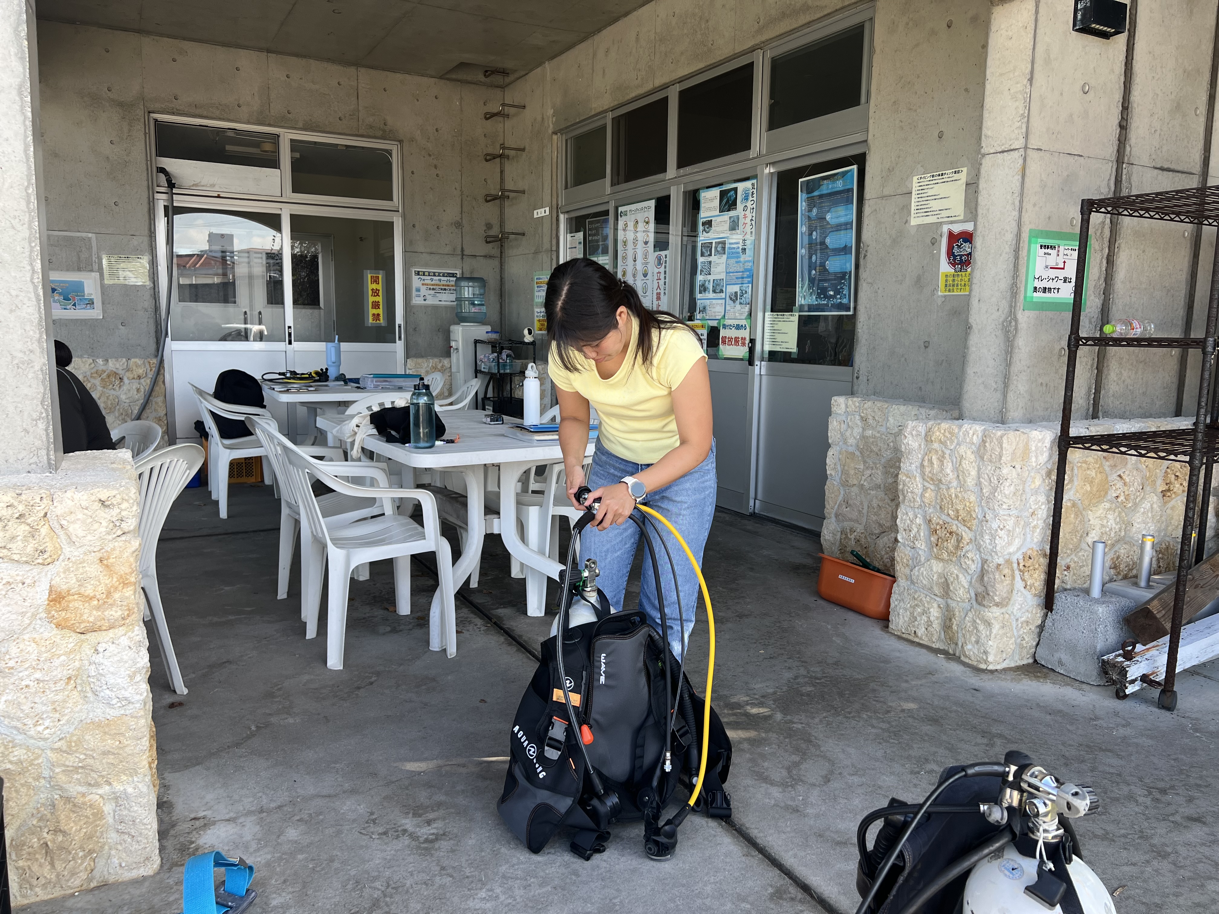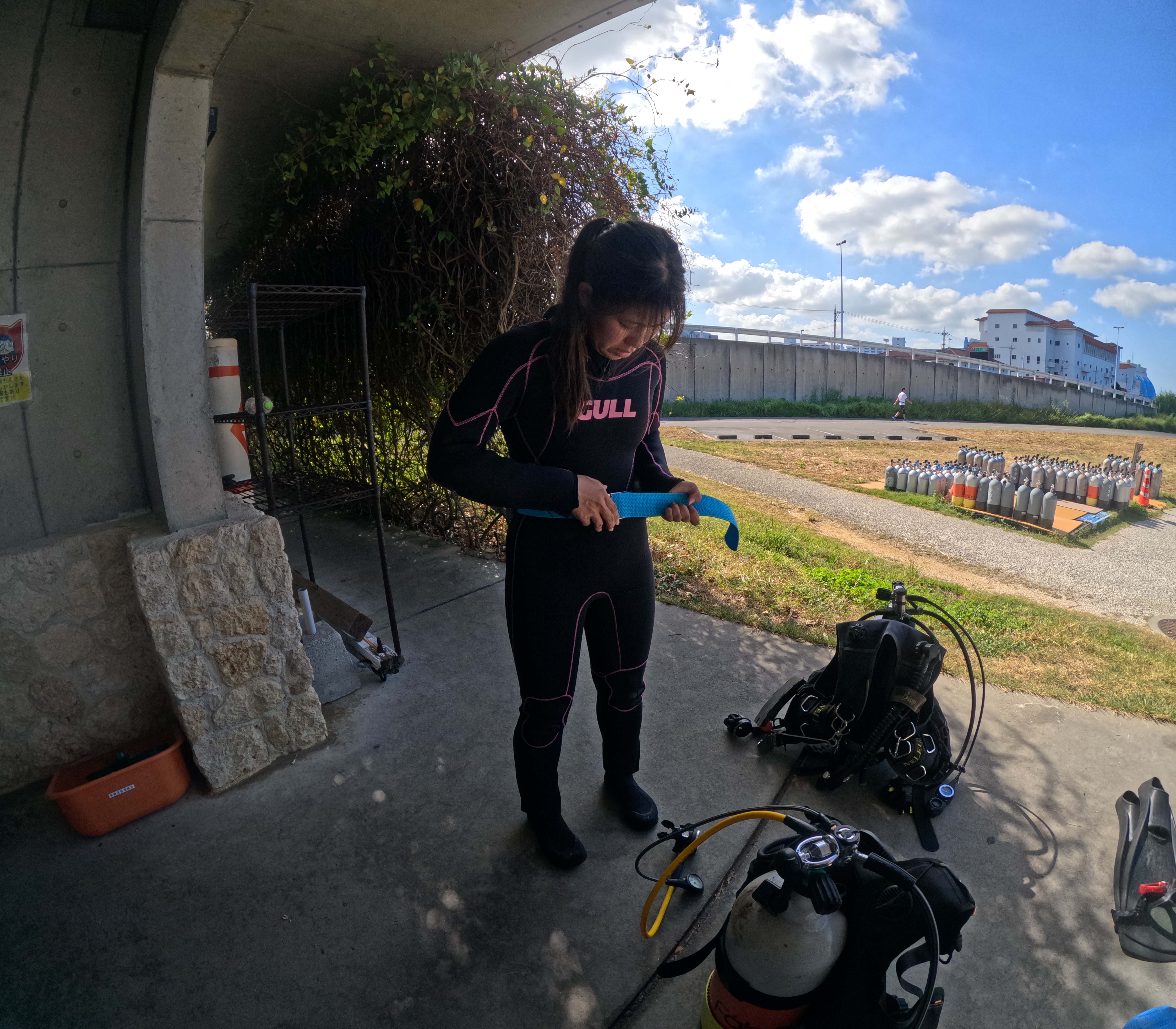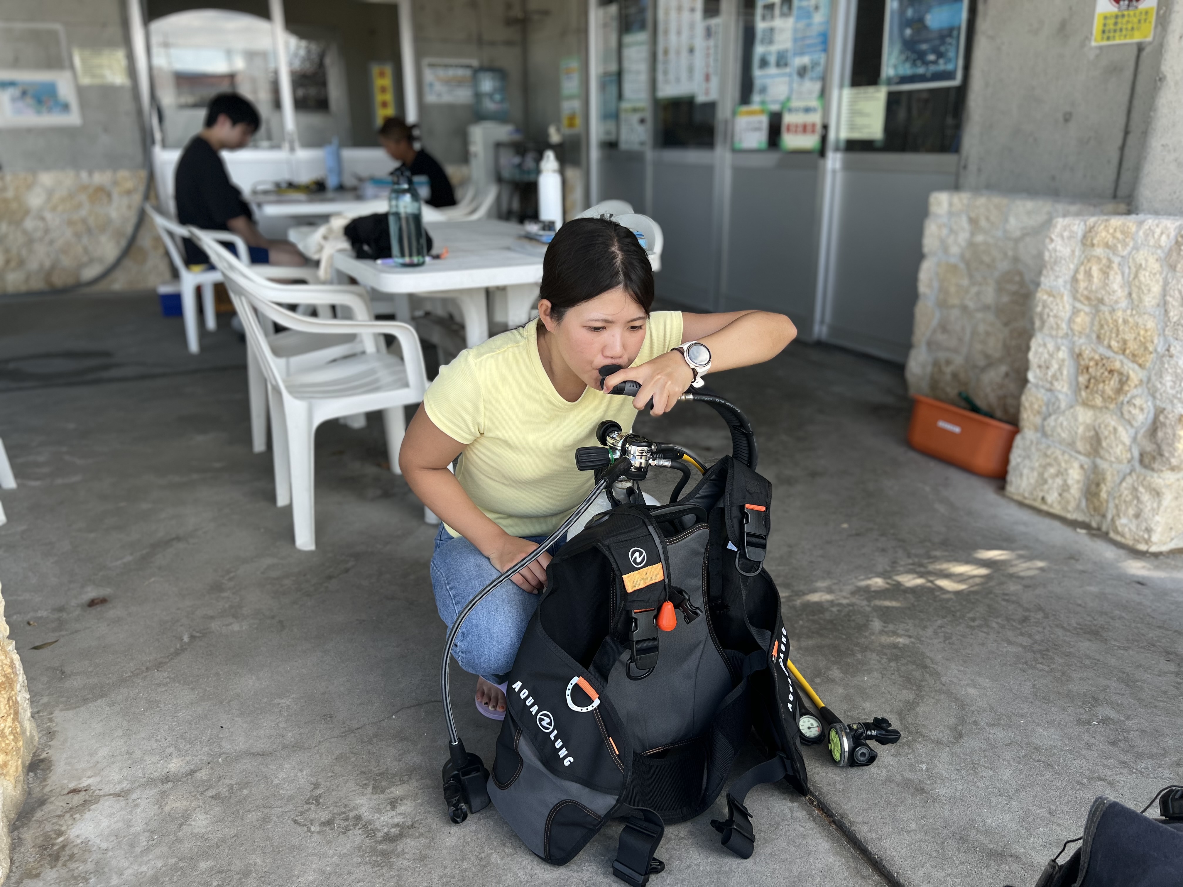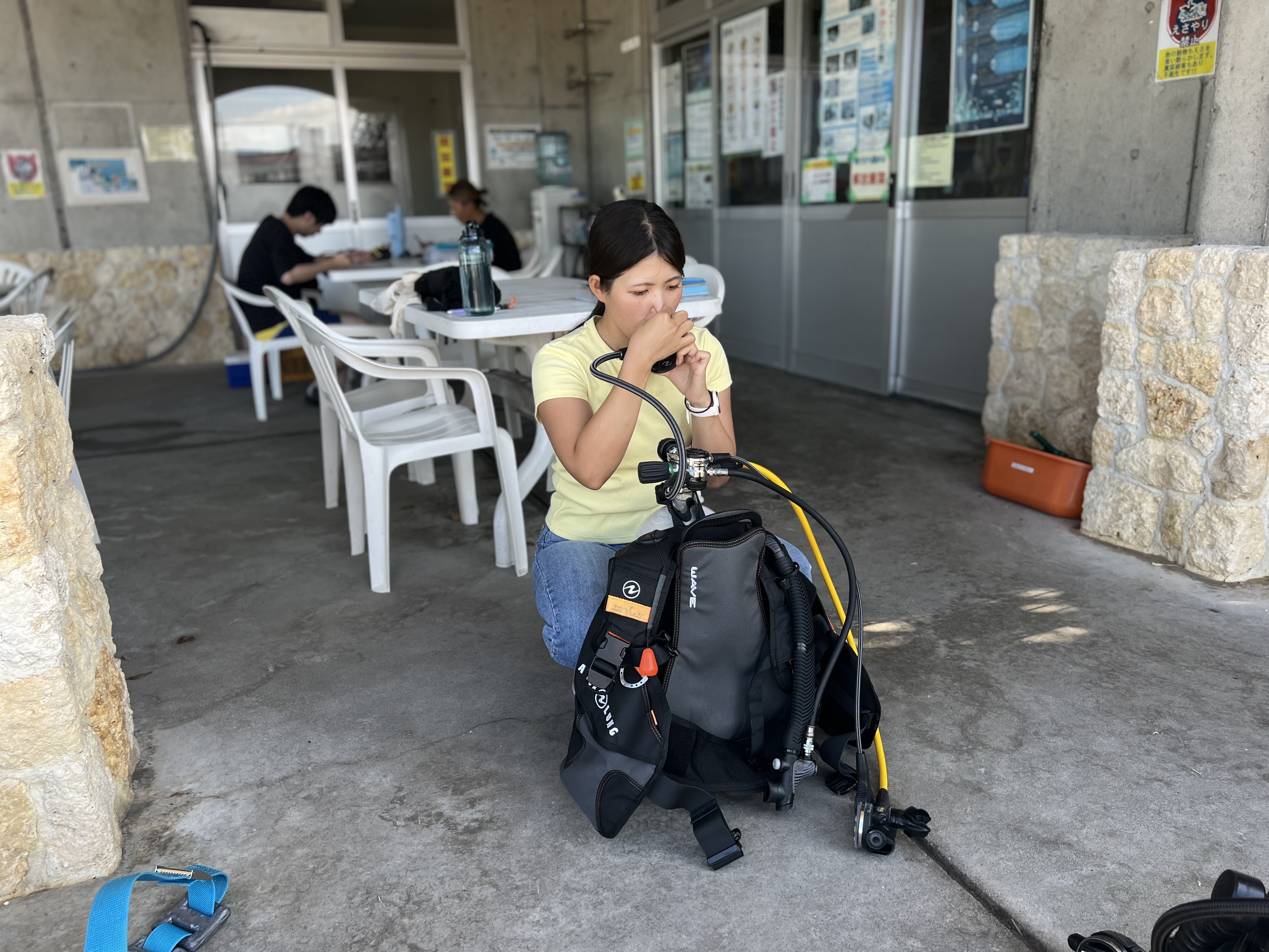 器材セッティングは、単に組み立てればよいだけではありません。楽しく安全にダイビングするための基本となるものですので、器材を身体に快適にフィットさせ、適切に作動させるために正しくセッティングする必要があります。覚えることが多く初めて行う方にとってはなかなか難しいですが、器材の名称やその役割をしっかりと理解し動作を繰り返し行うことで徐々に覚えていき、回数を重ねるごとにめきめきと上達していきました。