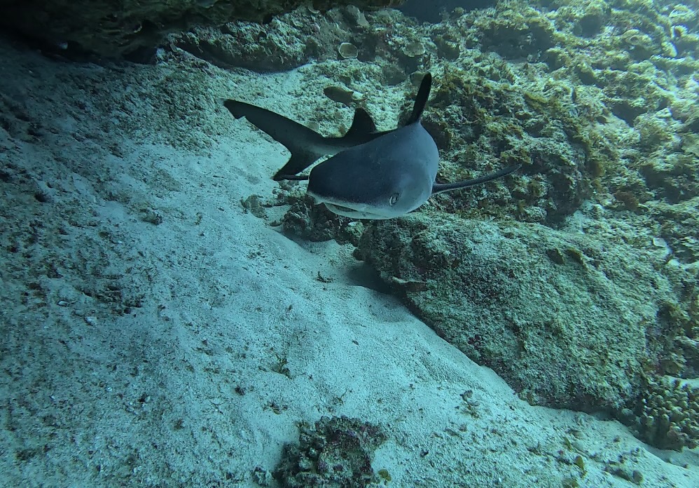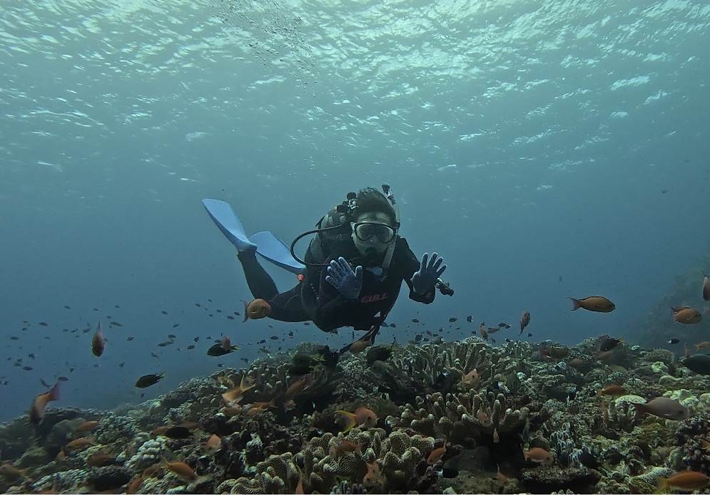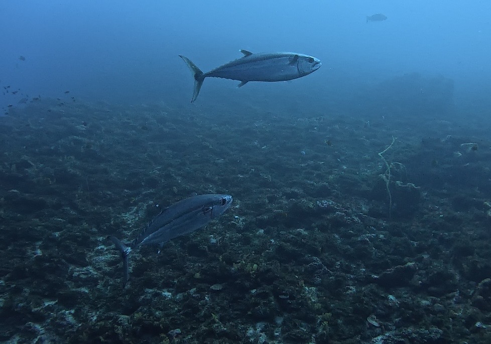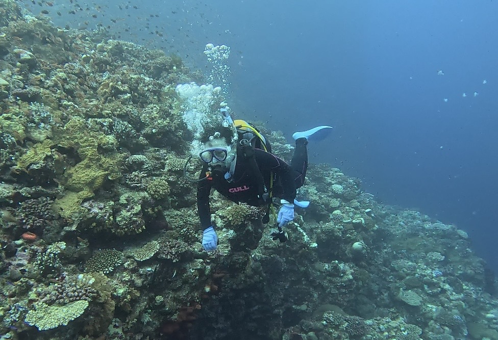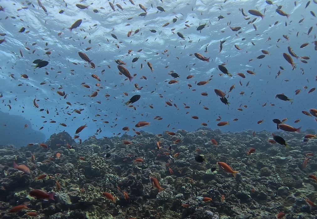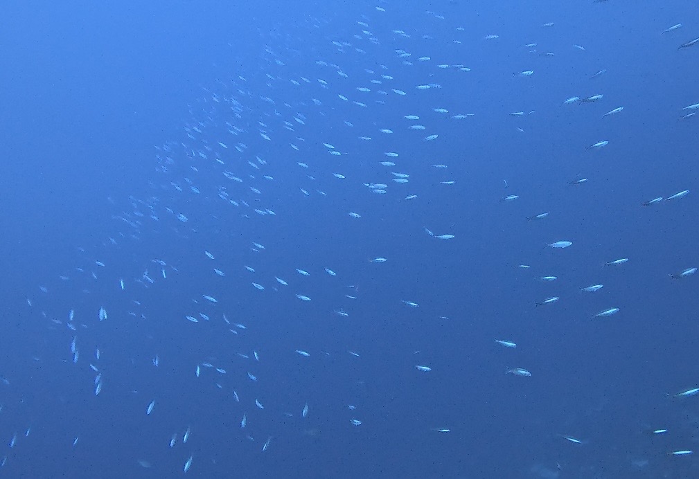 エントリーから、何度も練習した指標を使わない自由潜降行います。繰り返し練習した成果も表れています。潮の流れに乗って泳いで行き、ダイナミックな地形と、たくさんの魚の群れなどを見て楽しんで来ました。