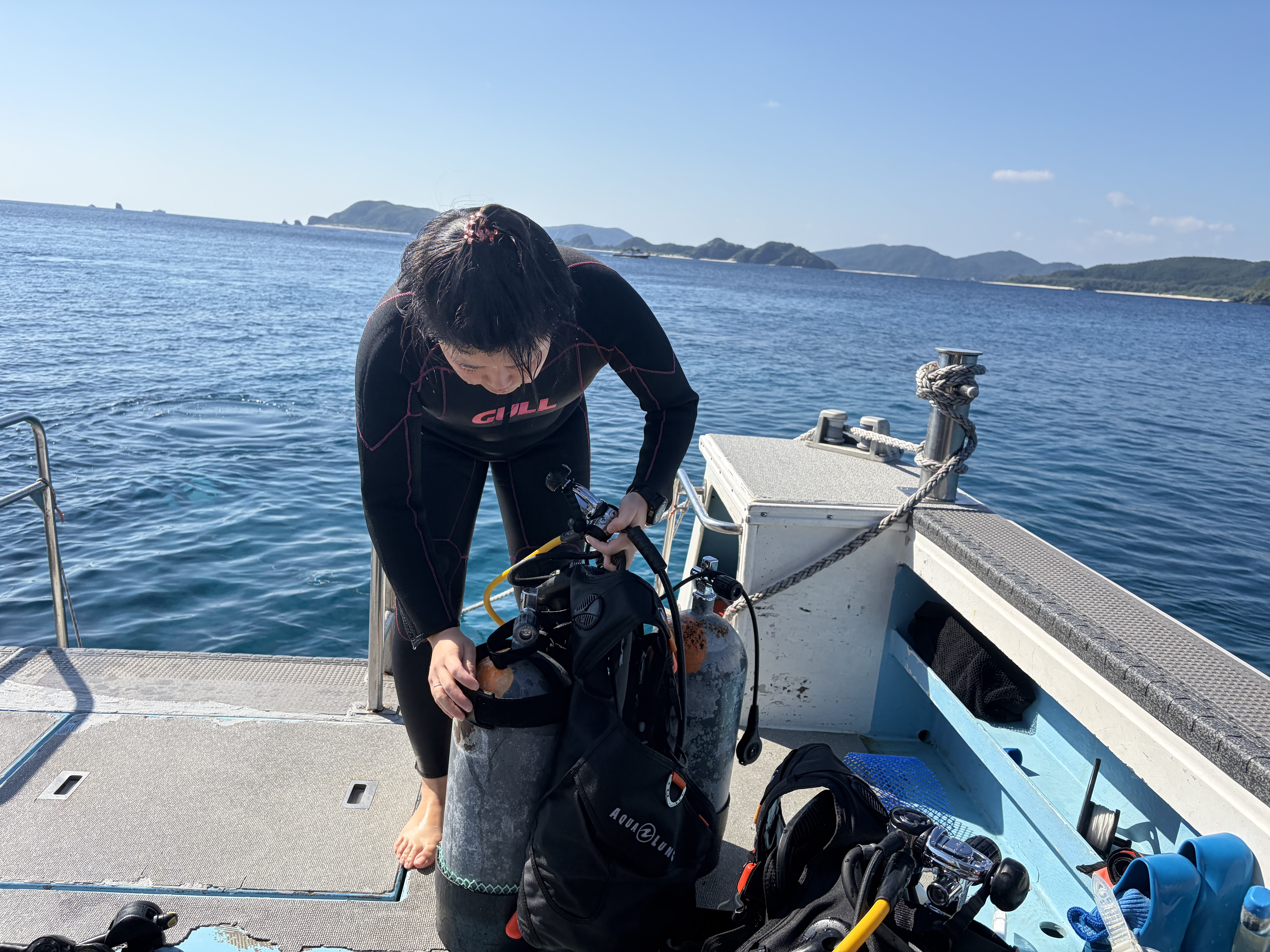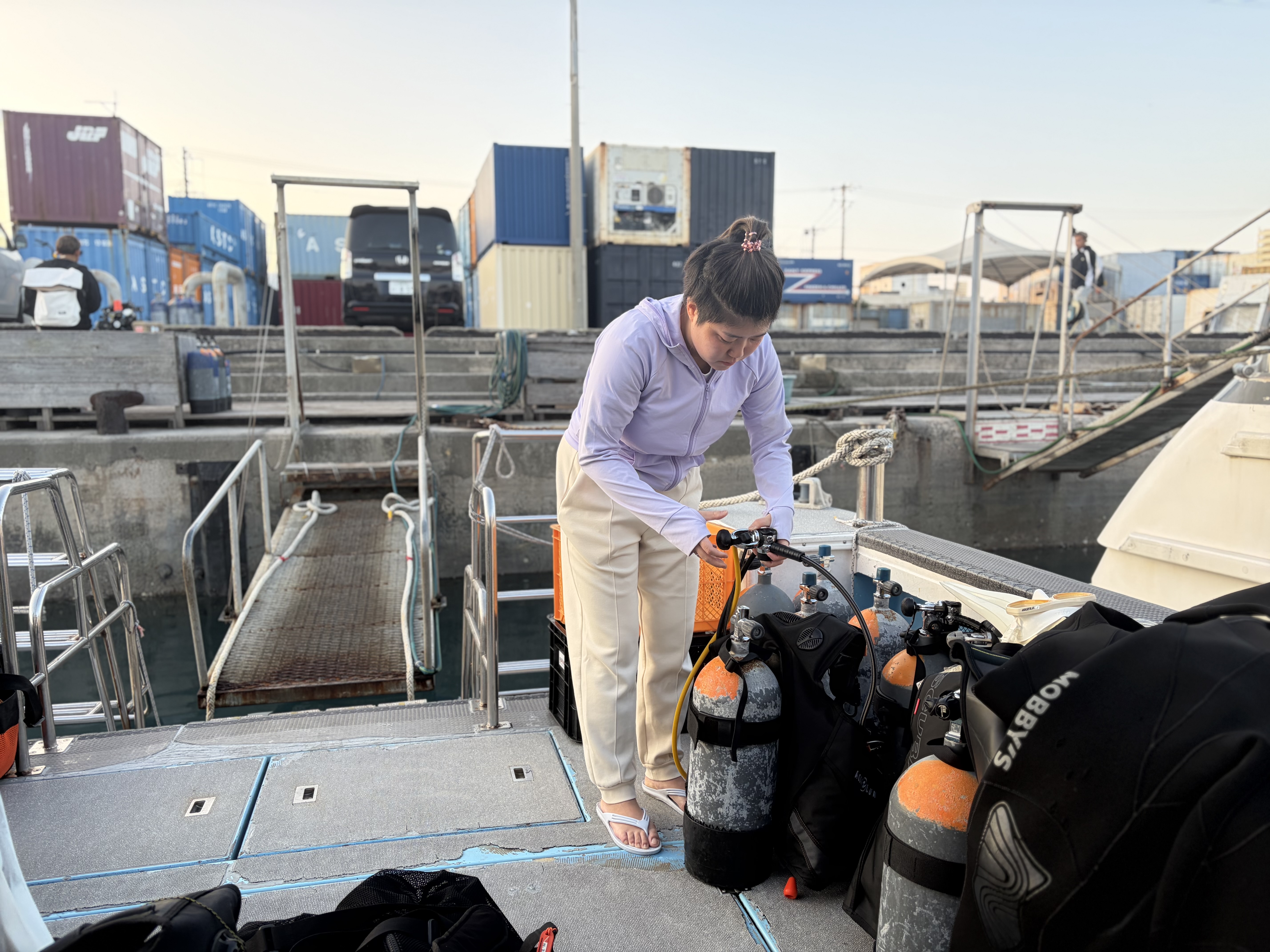 出航前の朝の準備、まずはボート上での器材のセッティングと作動点検から始まります。常に安全にダイビングをするためには基本事項の徹底が大切となります。これまでたくさん練習したので、スムーズに行うことが出来ました。