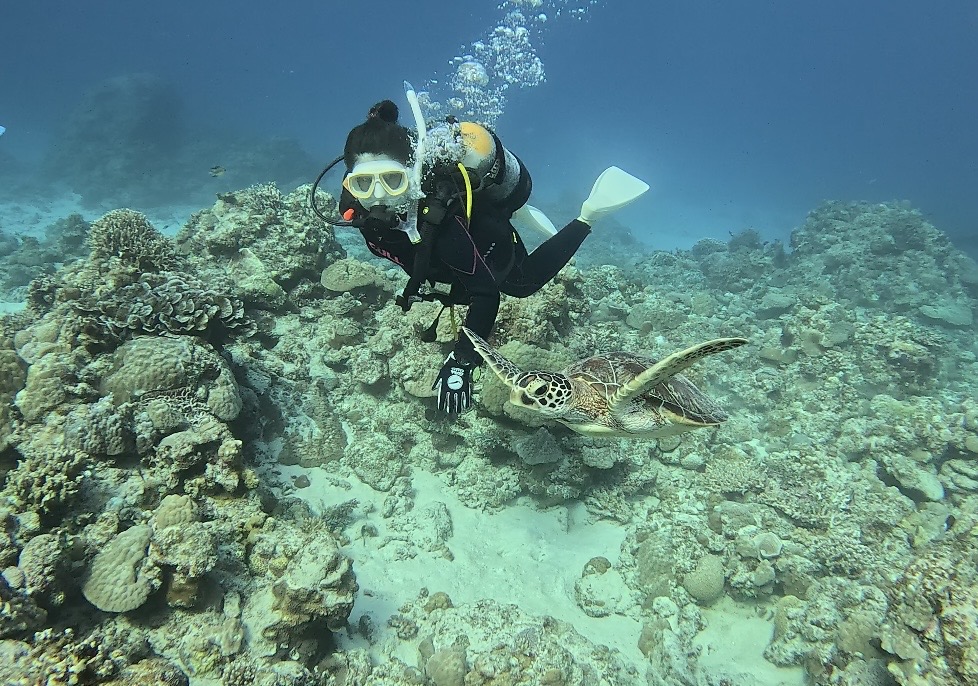 講習中、幸運にもウミガメと遭遇したので、一緒に泳いだり写真を撮ったりして時間を過ごして来ました。