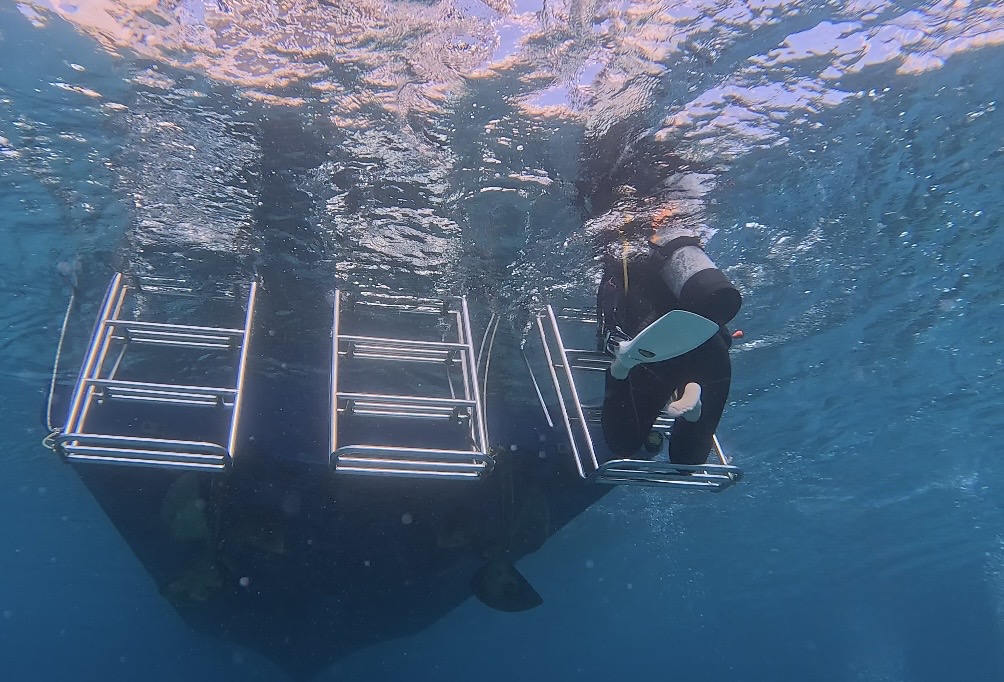エキジットはラダーにしっかりとつかまりながら、フィンを外してボートへ戻ります。