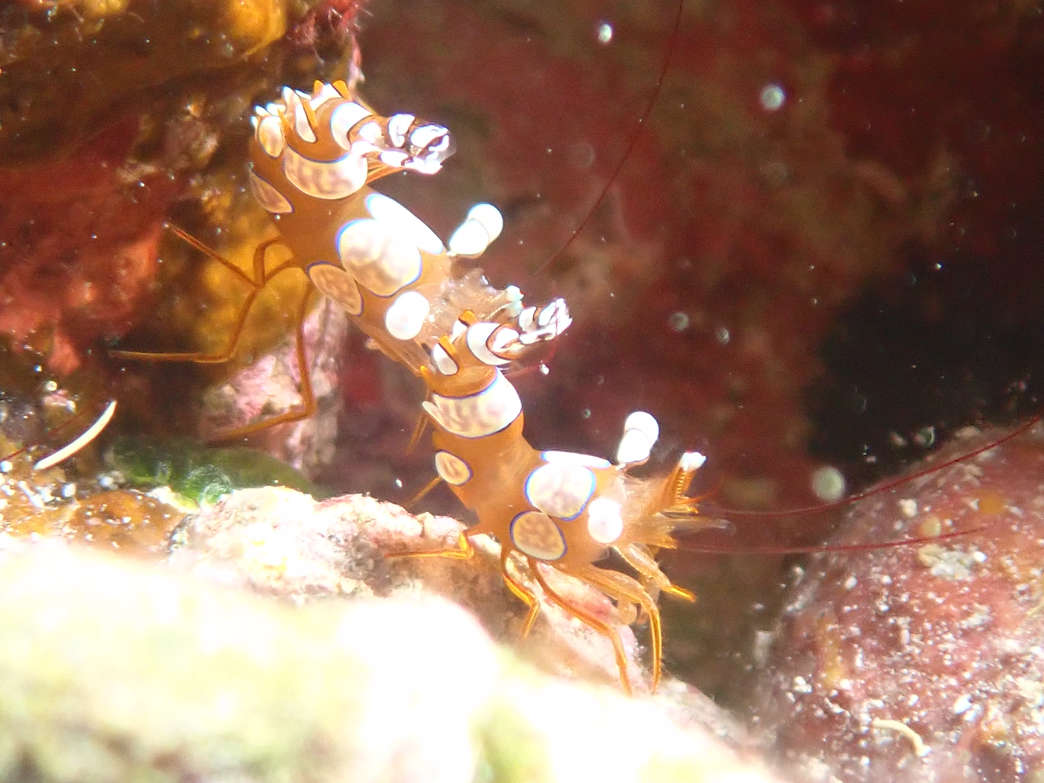 イソギンチャクモエビは、まさに海老反りのエビなんです。イソギンチャクや枝系サンゴなどに好んで共生する2cm程度の小型のエビで、しっぽをのけ反らせて左右に動かすのが特徴的で、フリフリと動くその姿はとても可愛らしいです。