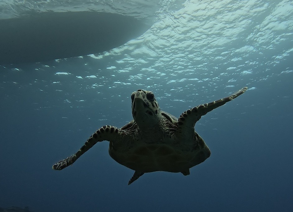 タイマイは、右前肢と左後肢、左前肢と右後肢を交互に前に出して泳ぎ、他のウミガメが両方の前肢を同時に出して平泳ぎのような泳ぎ方をするのとは違うんです。