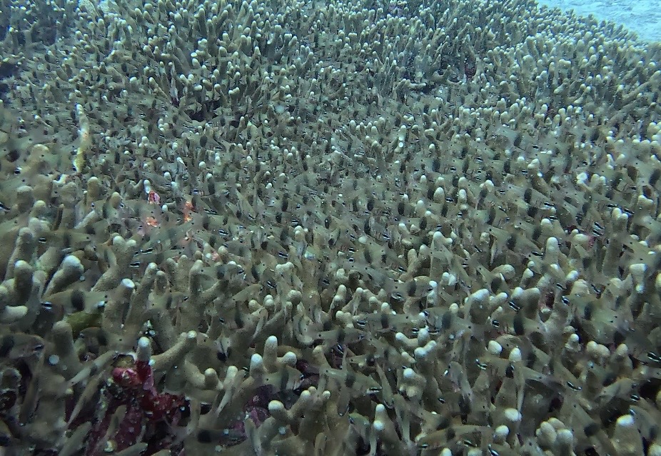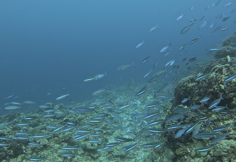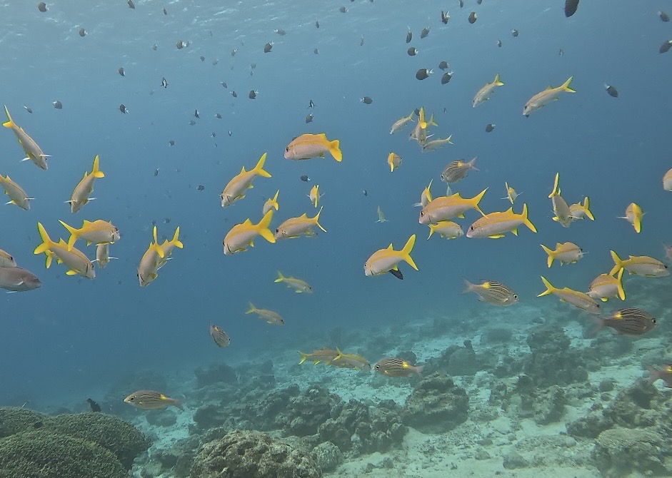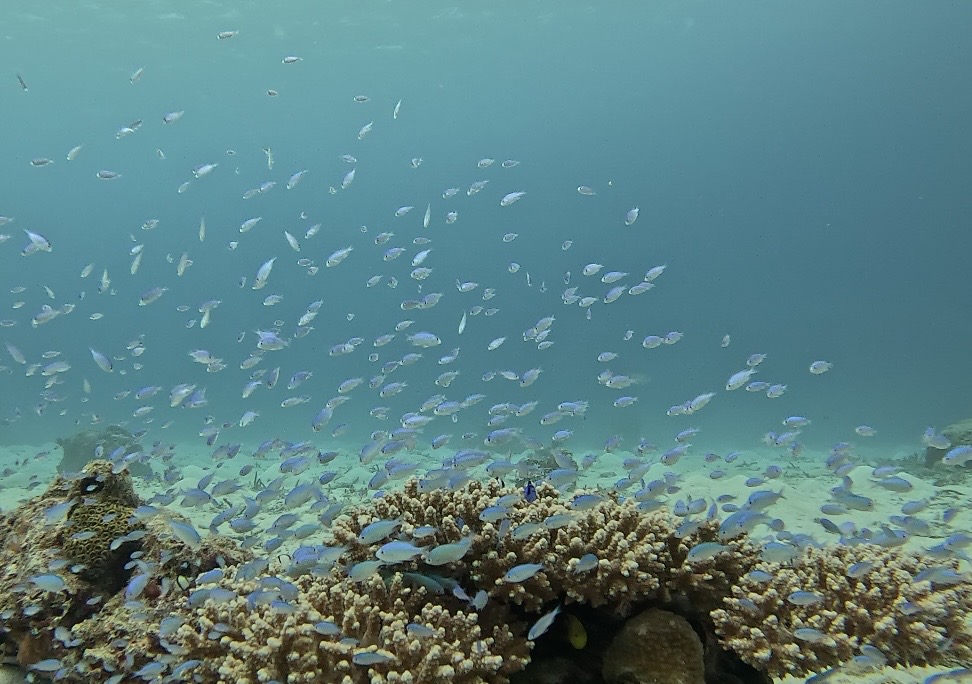 アオサンゴに、キンギョハナダイ、ハナゴイ、カスミチョウチョウウオ、キホシスズメダイなどがたくさん群れてついていますが、今日は終始グルクンの群れに圧倒されました。