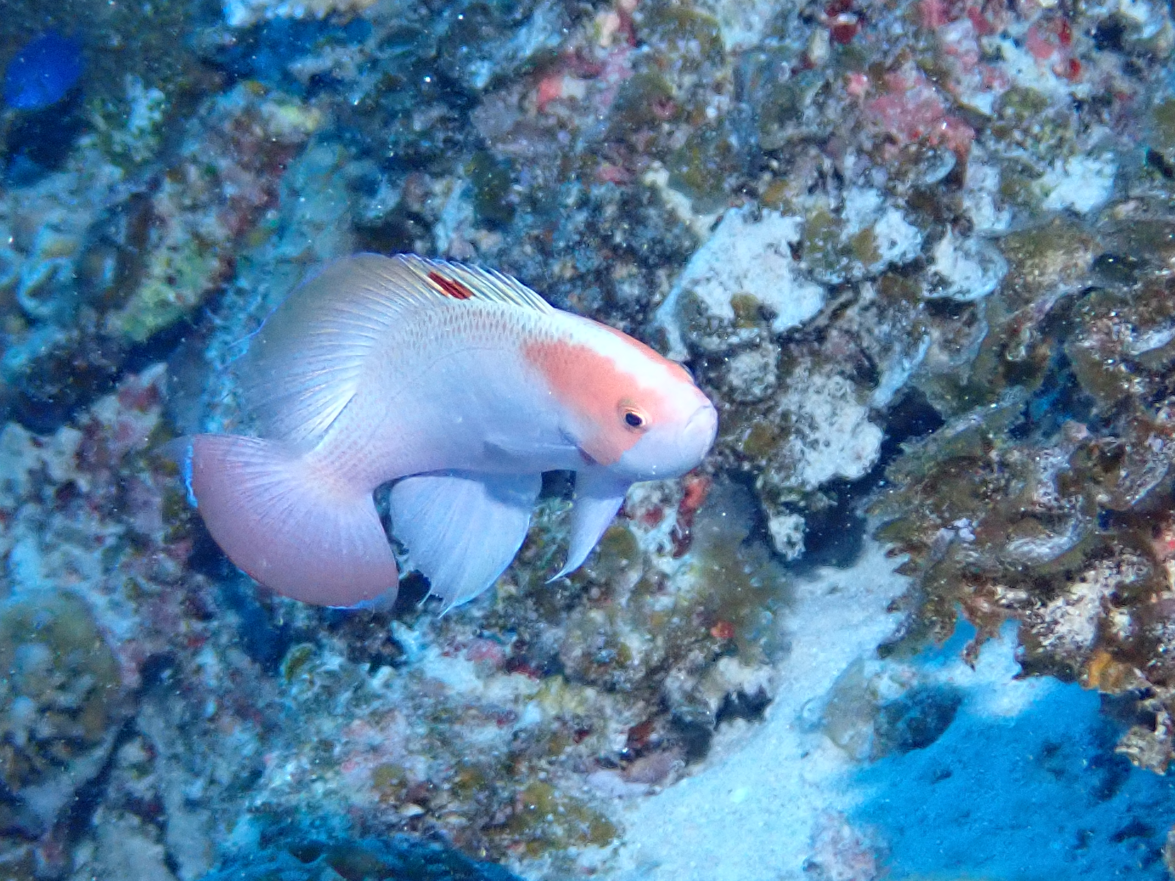全体的に淡いピンク~オレンジ色で、ハナダイの中では上品な色合いをしています。オスは婚姻色で白くなり、メスは尾ビレ後縁に赤い斑点があります。オスは他のハナダイとは尾鰭の形が違うので簡単に判別ができます。