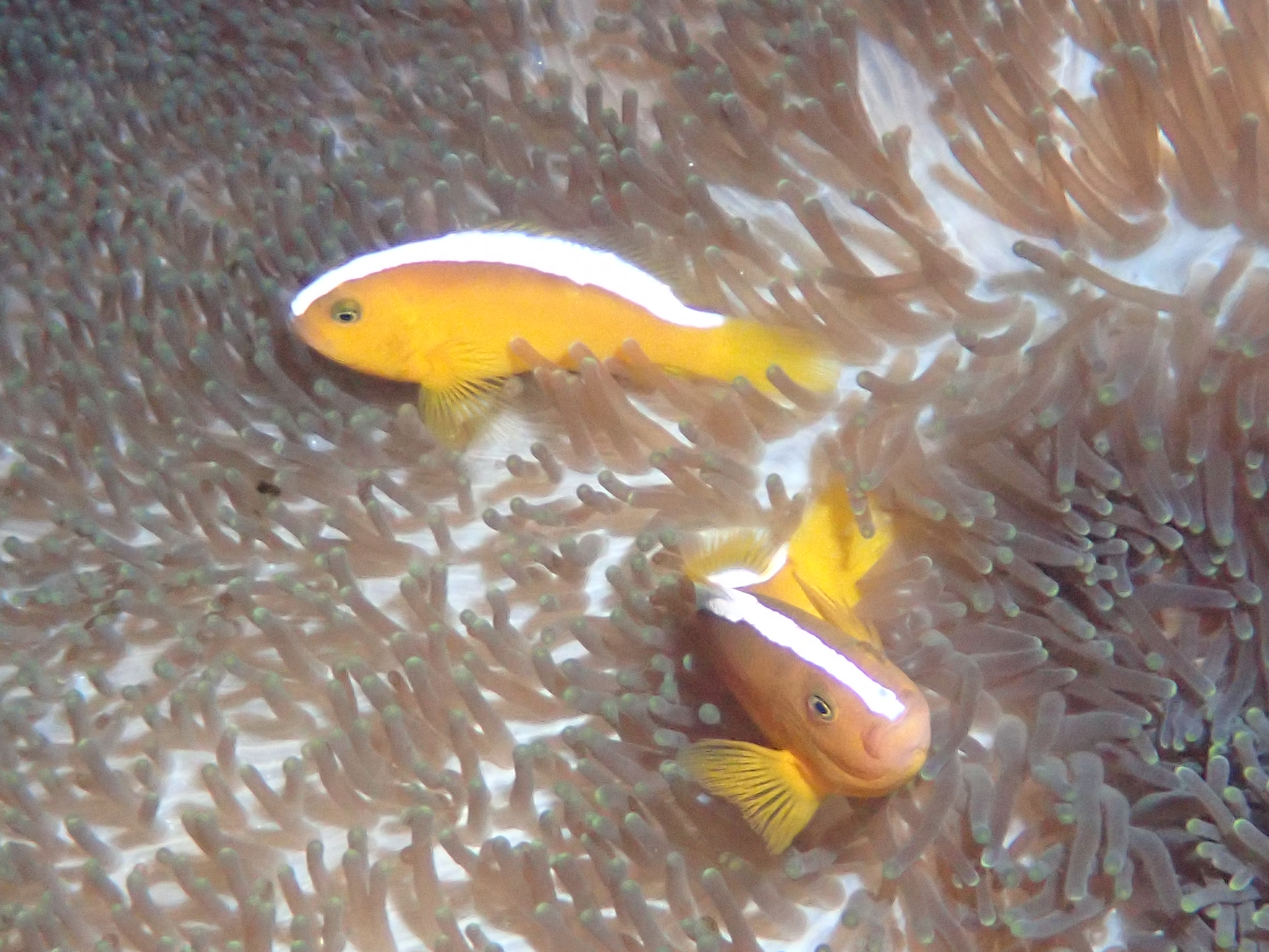 セジロクマノミは、YELLOW CLOWNFISH(イエロー・クラウンンフィッシュ)という英名もあり、水深3~20mの珊瑚礁や岩礁域でハタゴイソギンチャクや、シライトイソギンチャクと共生しています。