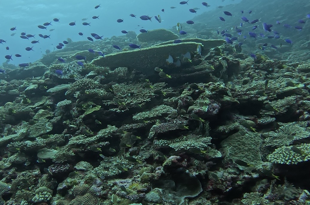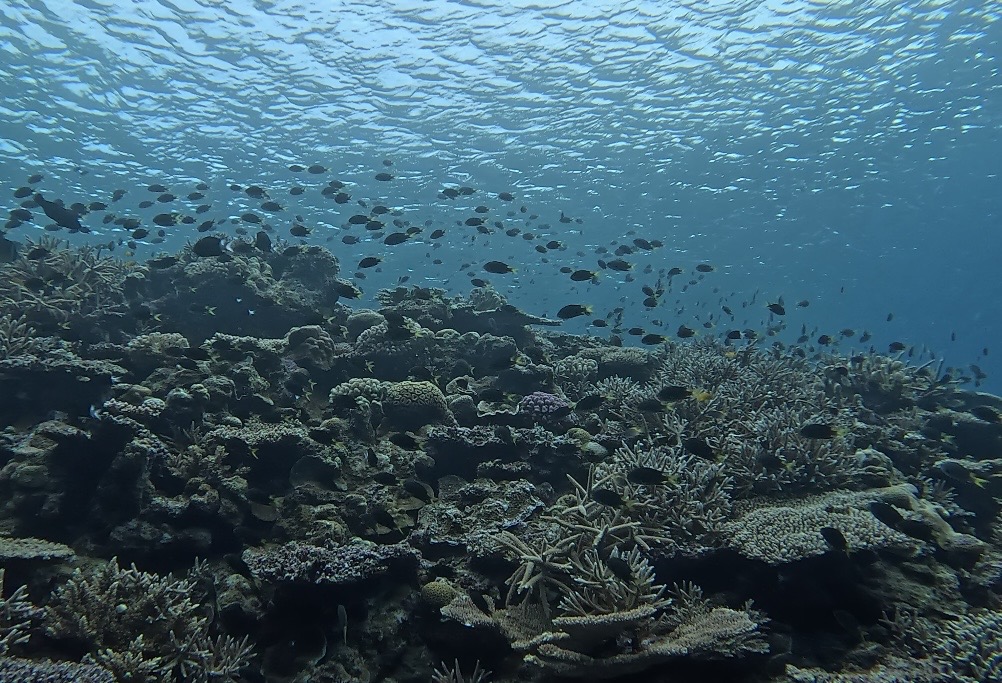 浅場の珊瑚にはスズメダイがびっしりとついていて、綺麗な景観を醸し出しています。