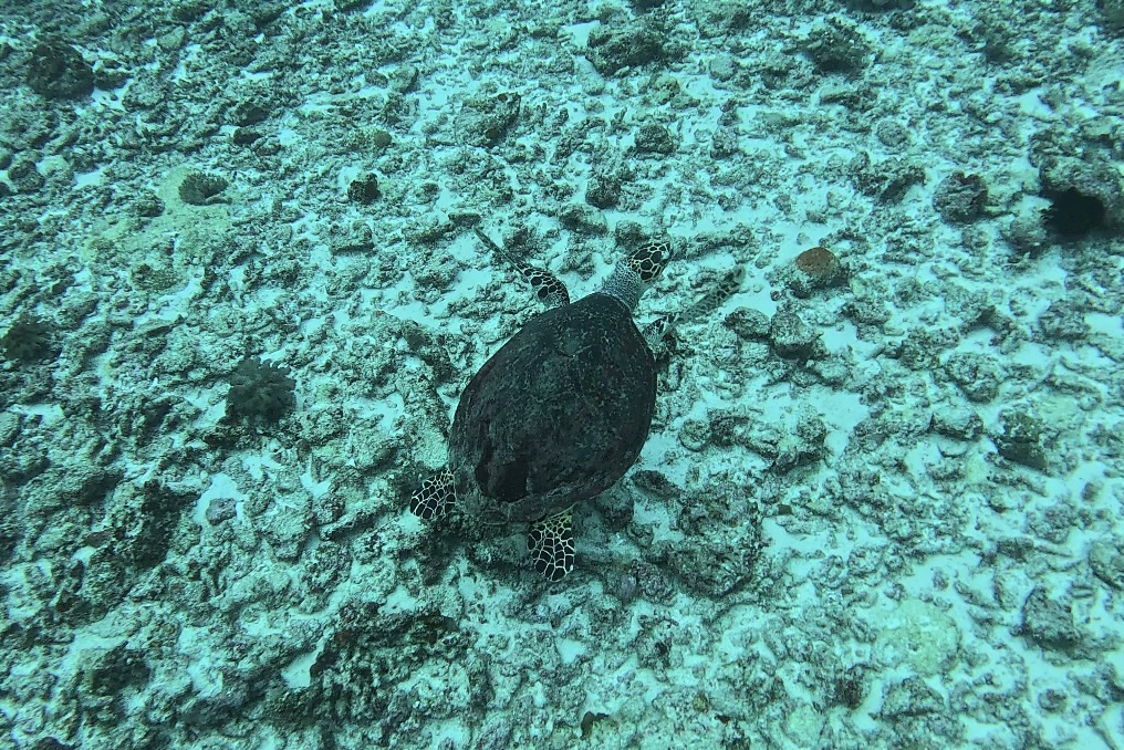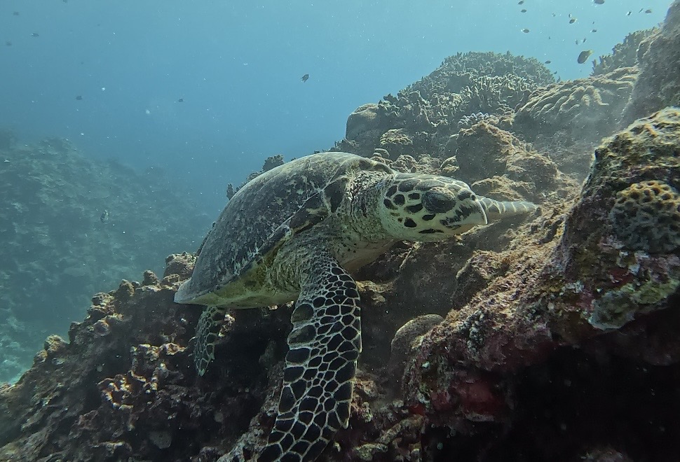 タイマイは、右前肢と左後肢、左前肢と右後肢を交互に前に出して泳ぎ、他のウミガメが両方の前肢を同時に出して平泳ぎのような泳ぎ方をするのとは違うんです。