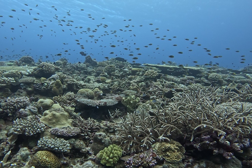 浅場の珊瑚にはスズメダイがびっしりとついていて、綺麗な景観を醸し出しています。