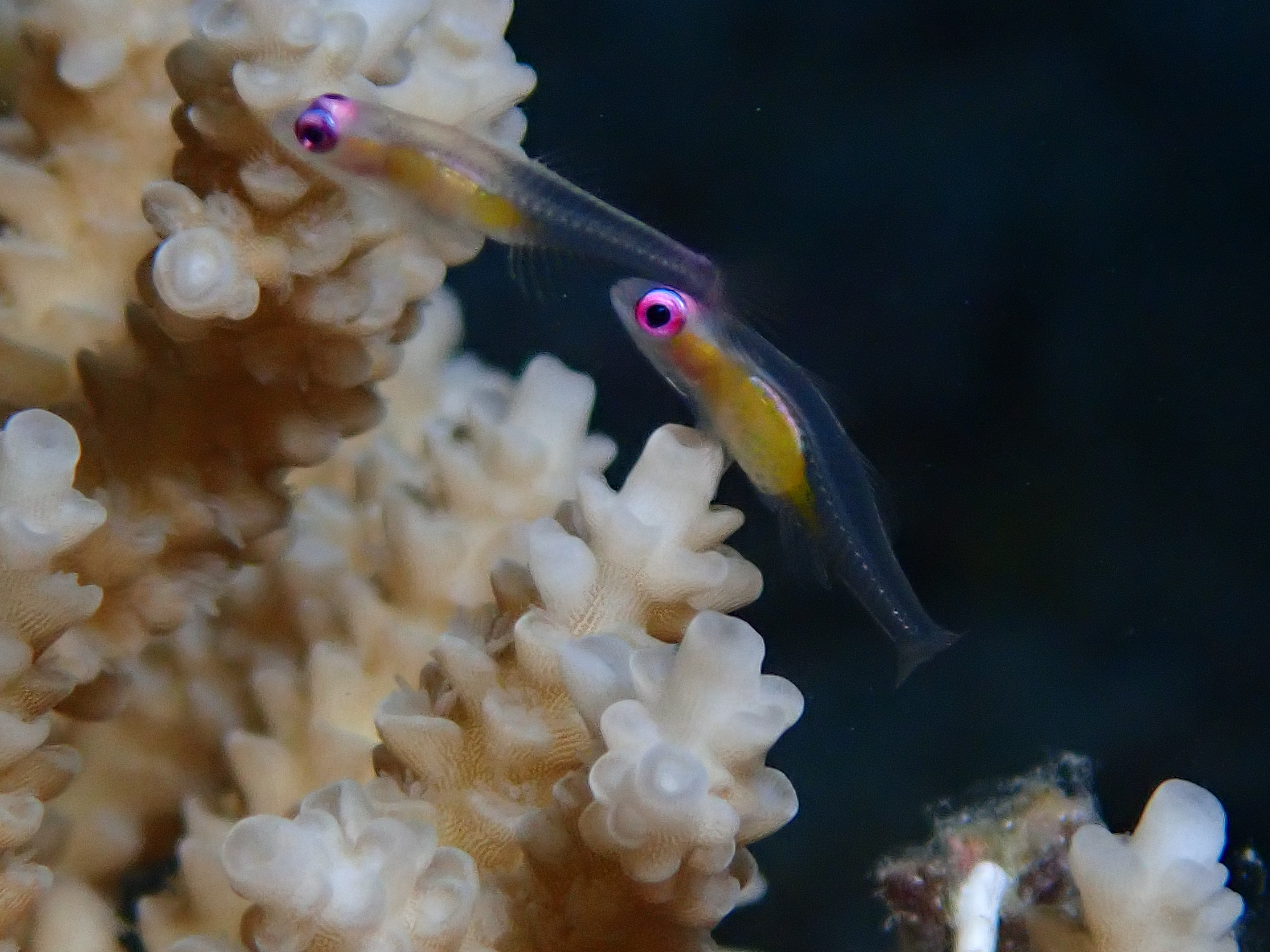 アカメハゼは体は背部が透明で腹部が黄色、眼は大きく、虹彩は桃色をしています。体長1.5cmほどの小型種で、琉球列島からインド・太平洋に分布し、水深20m以浅の珊瑚域に生息しています。ミドリイシやテーブル状サンゴの周辺でホバリングしています。