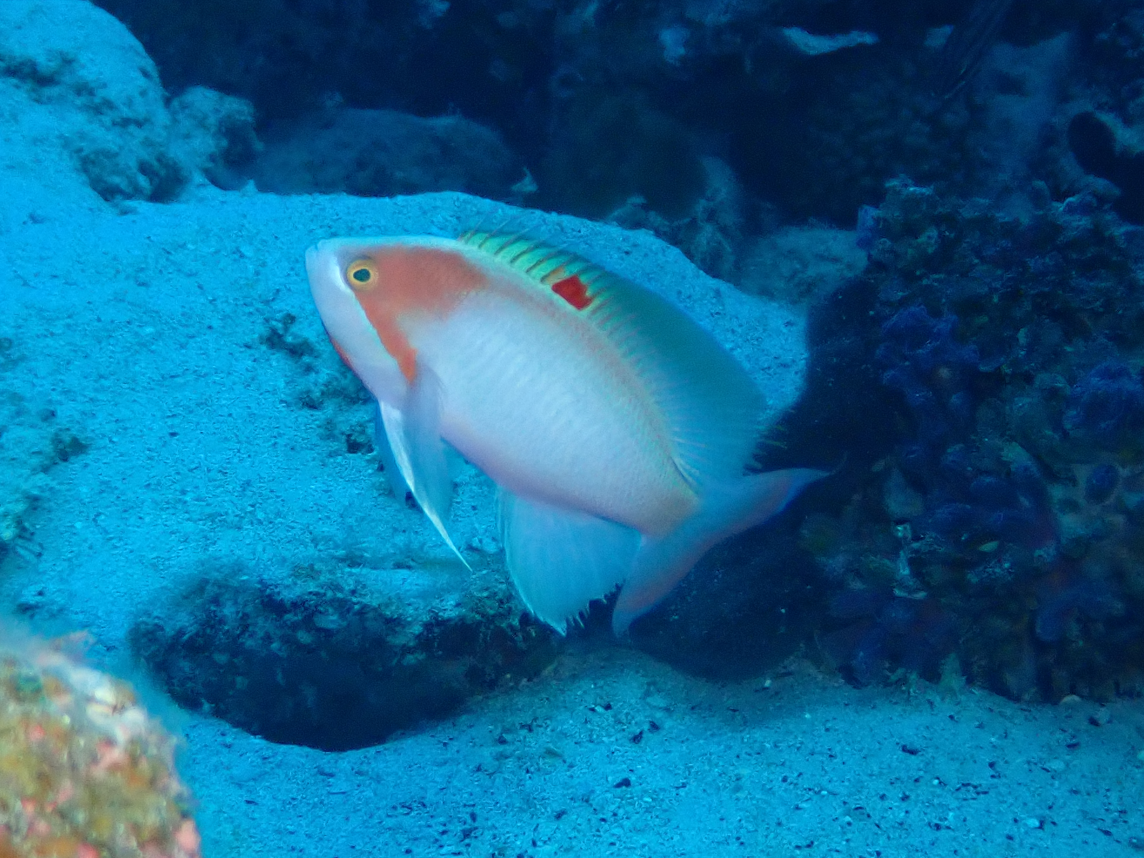 全体的に淡いピンク~オレンジ色で、ハナダイの中では上品な色合いをしています。オスは婚姻色で白くなり、メスは尾ビレ後縁に赤い斑点があります。オスは他のハナダイとは尾鰭の形が違うので簡単に判別ができます。
