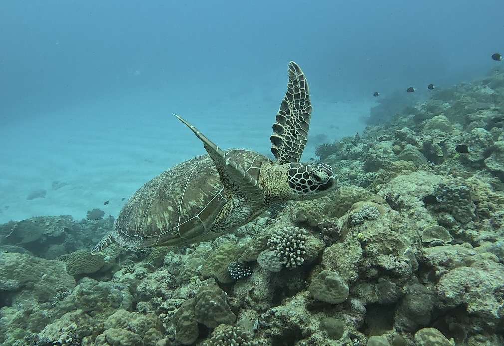 アオウミガメは、green turtleという英名で絶滅危惧種に指定されていて、世界中の熱帯・亜熱帯海域に分布し、国内では小笠原諸島や南西諸島を中心に産卵が確認されています。