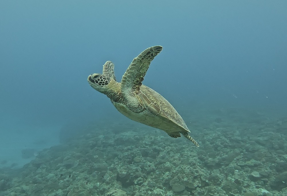 アオウミガメは、green turtleという英名で絶滅危惧種に指定されていて、世界中の熱帯・亜熱帯海域に分布し、国内では小笠原諸島や南西諸島を中心に産卵が確認されています。