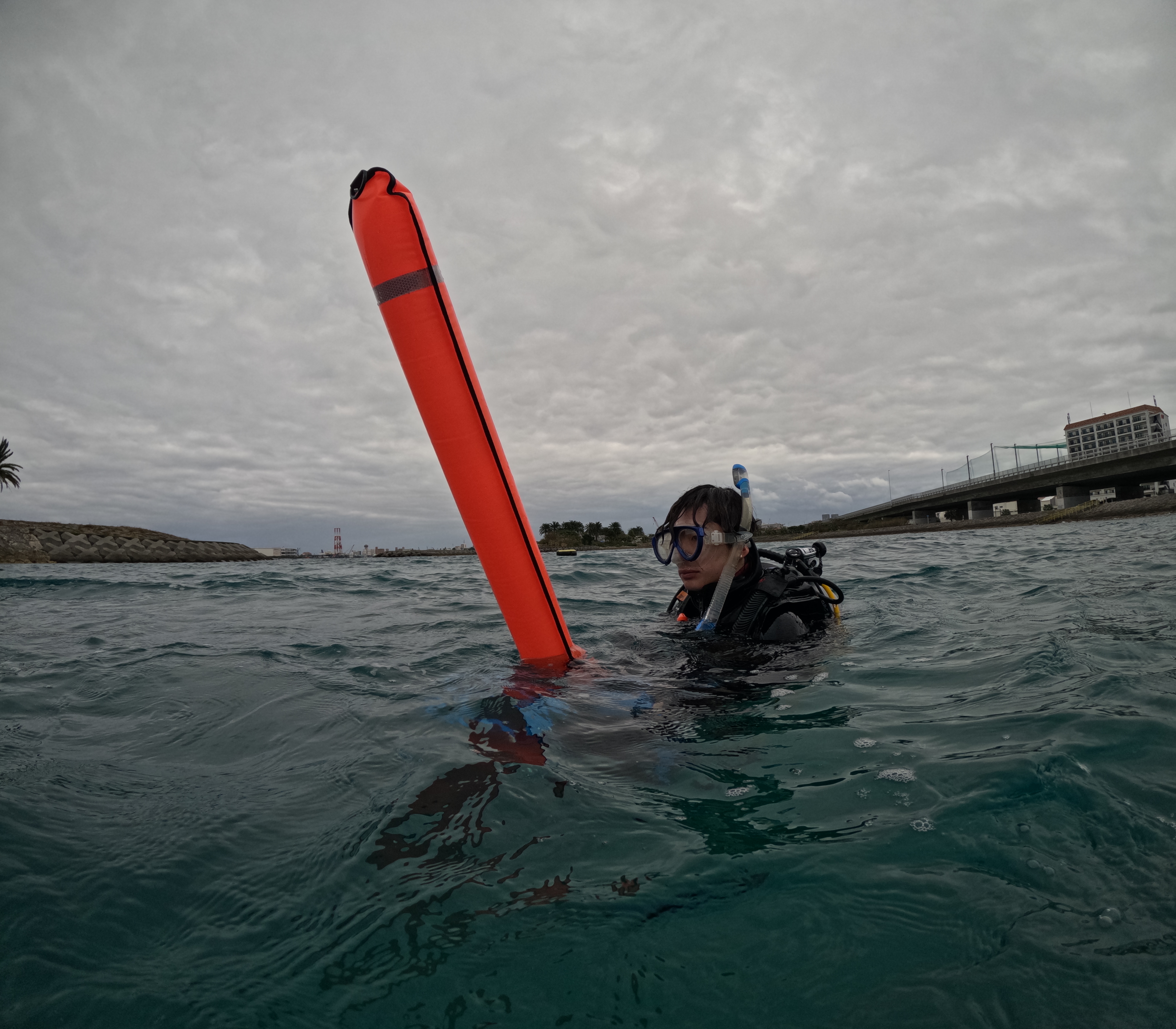 水面でオーラルによるBCDへの給気は、エア切れ時の重要な対応スキルですので、初めは足の着く海域でしっかりとイメージしながら練習します。