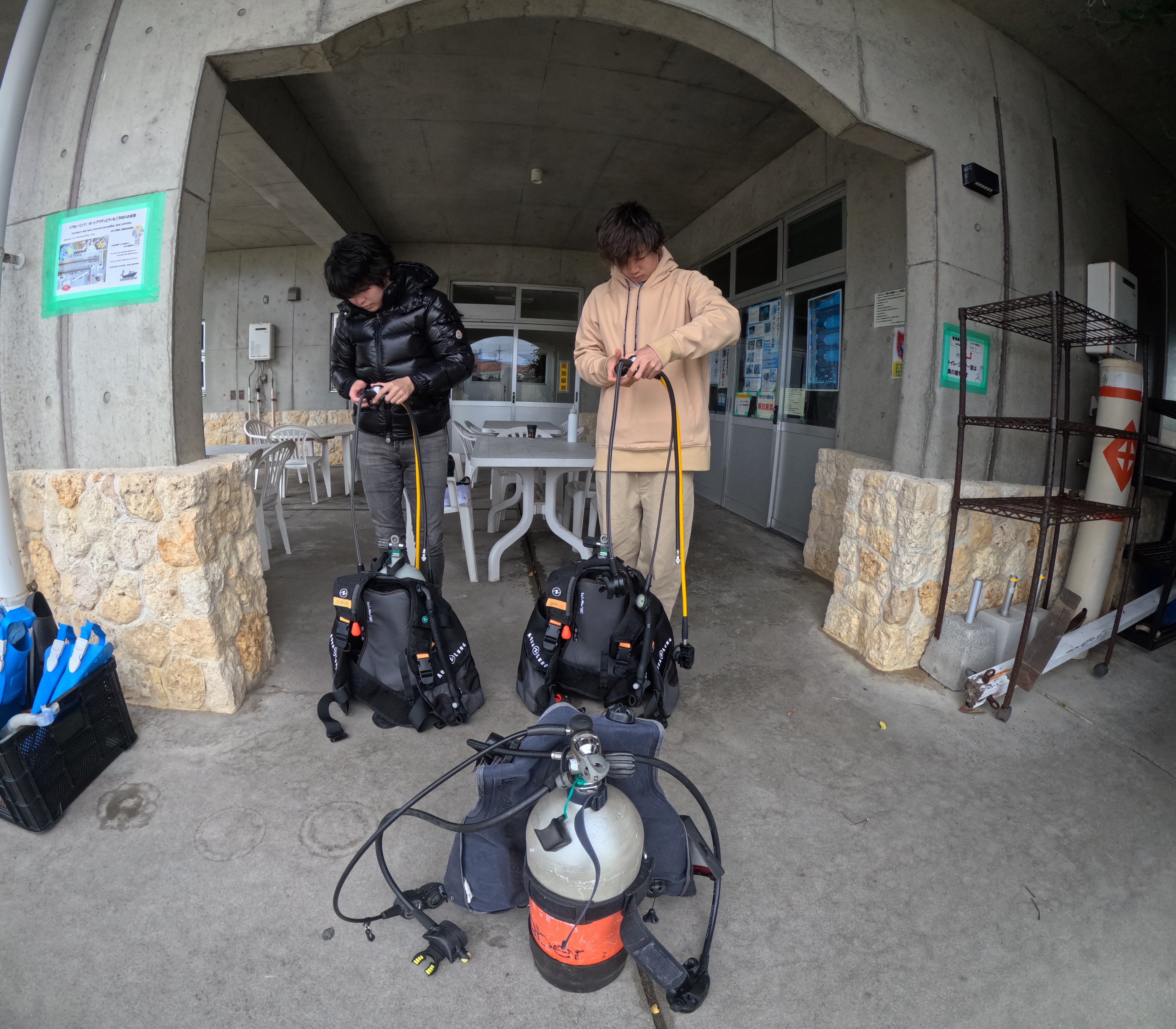 器材セッティングは、単に組み立てればよいだけではありません。楽しく安全にダイビングするための基本となるものですので、器材を身体に快適にフィットさせ、適切に作動させるために正しくセッティングする必要があります。覚えることが多く初めて行う方にとってはなかなか難しいですが、器材の名称やその役割をしっかりと理解し動作を繰り返し行うことで徐々に覚えていき、回数を重ねるごとにめきめきと上達していきました。