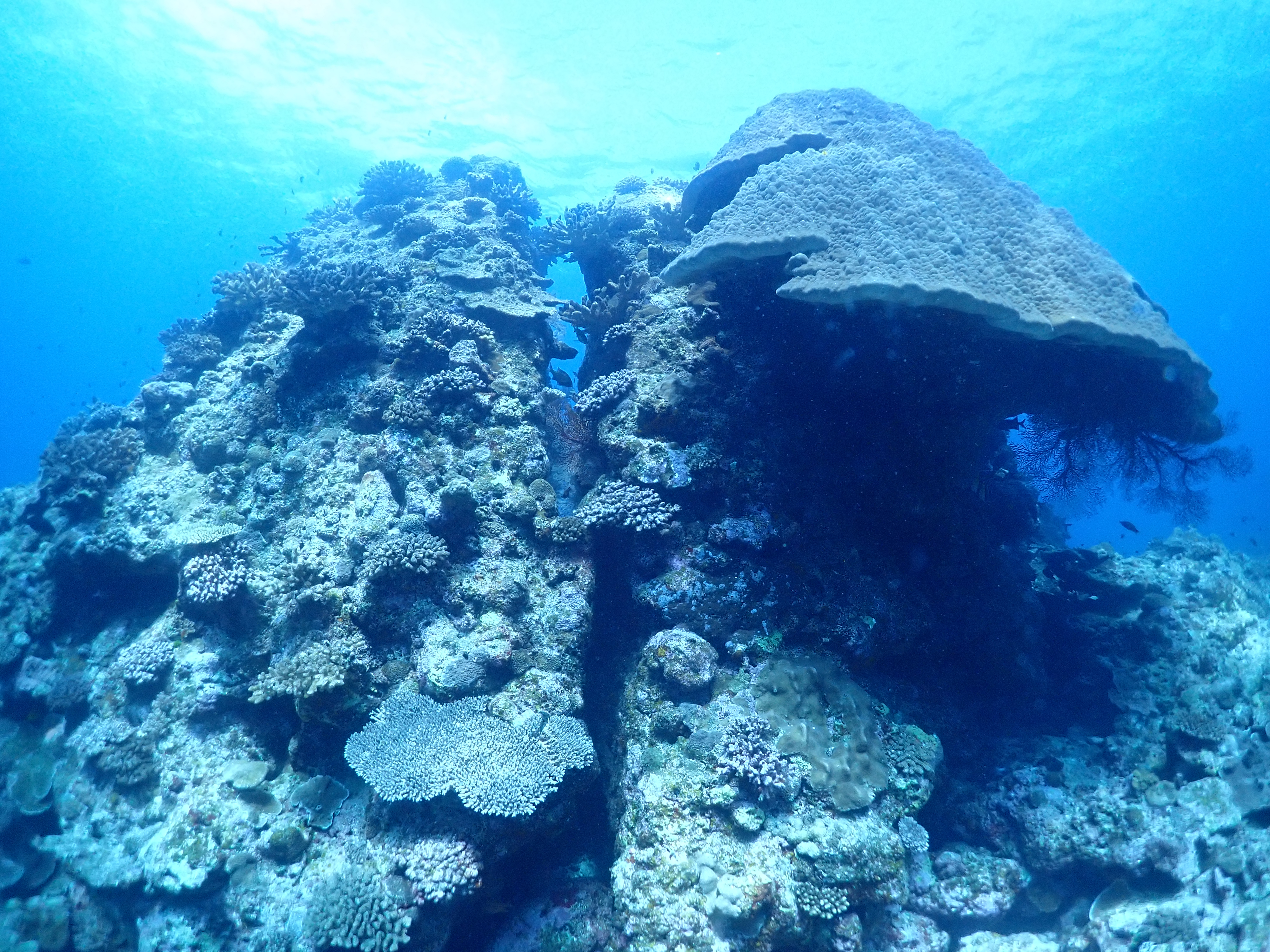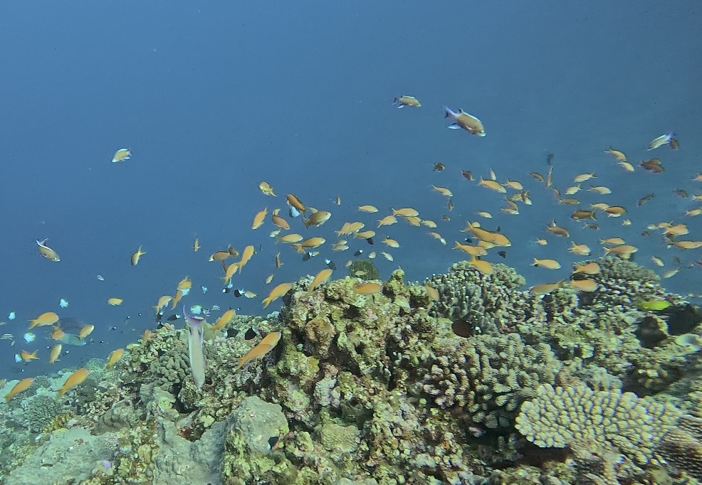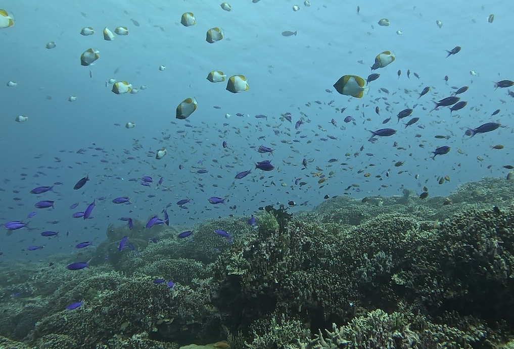 ハナゴイやキホシスズメダイ、カスミチョウチョウウオなどの群れが珊瑚の上を覆いつくしています。