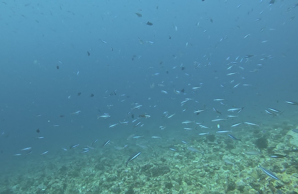 エントリー直後の浅場には、オオメカマスが20匹程群れてぐるぐると泳ぎ回っていました。