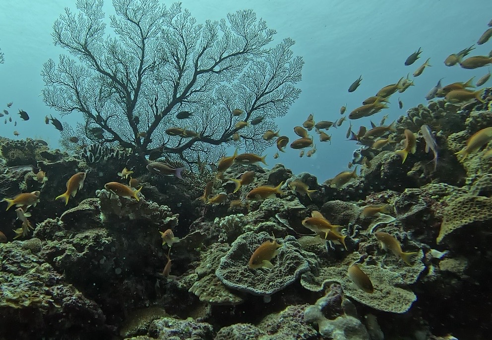 ハナゴイやキホシスズメダイ、カスミチョウチョウウオなどの群れが珊瑚の上を覆いつくしています。